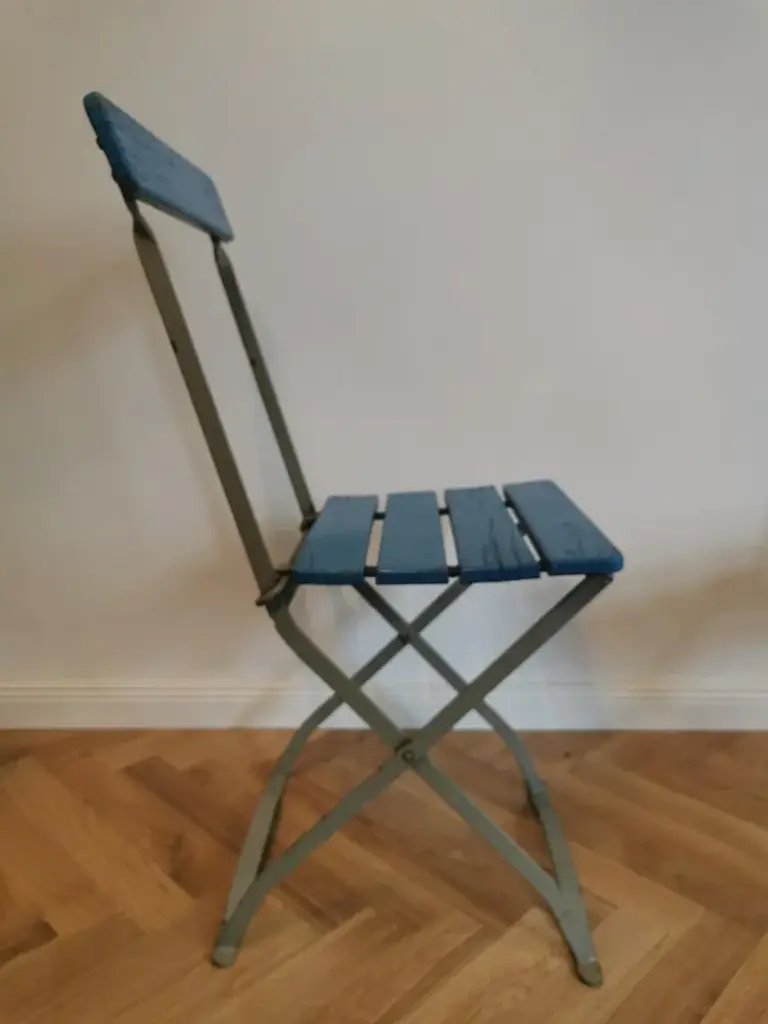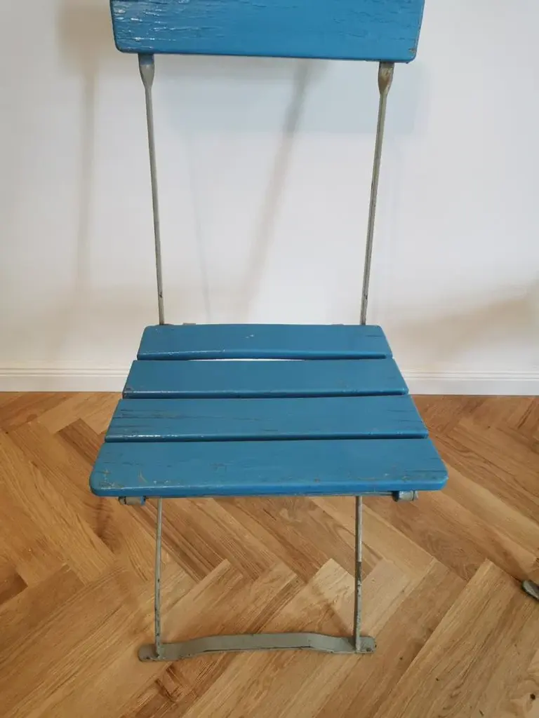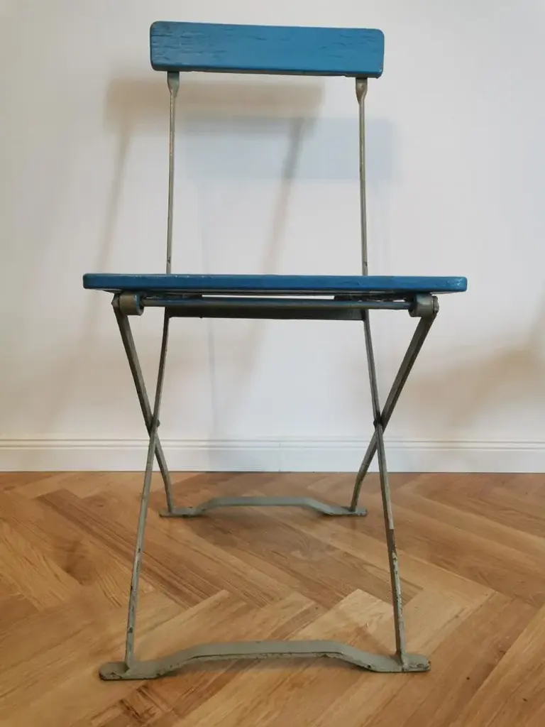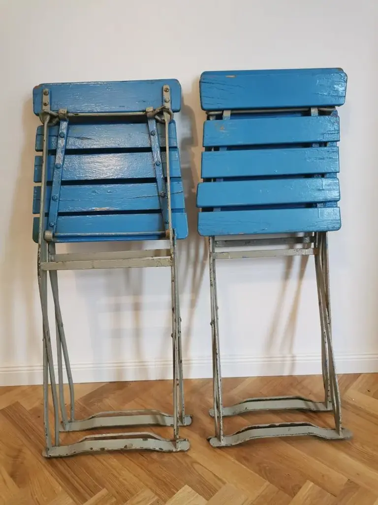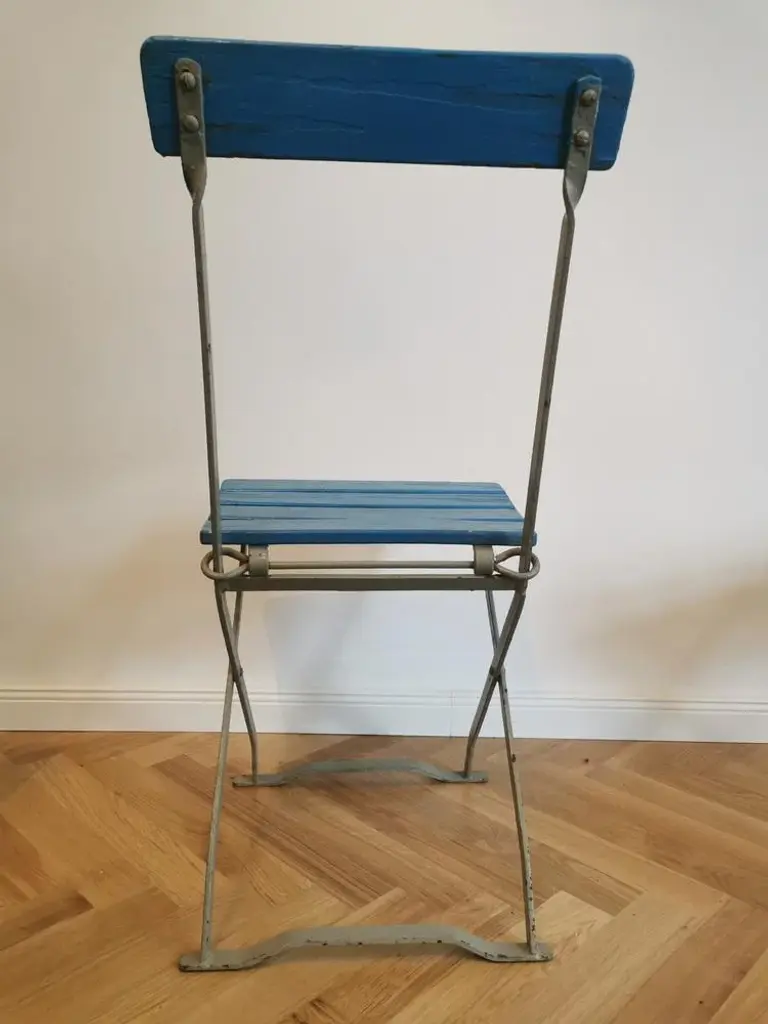 Very robust German beer garden chair, bistro chair, garden folding chair approx. 1920s 1940s, made of 6mm thick blacksmith, seat and backrest made of blue painted oak, seat 40 x 32 cm, seat height 48 cm, height folded up 100 cm, joint rivet. Weight per chair 8 kg.