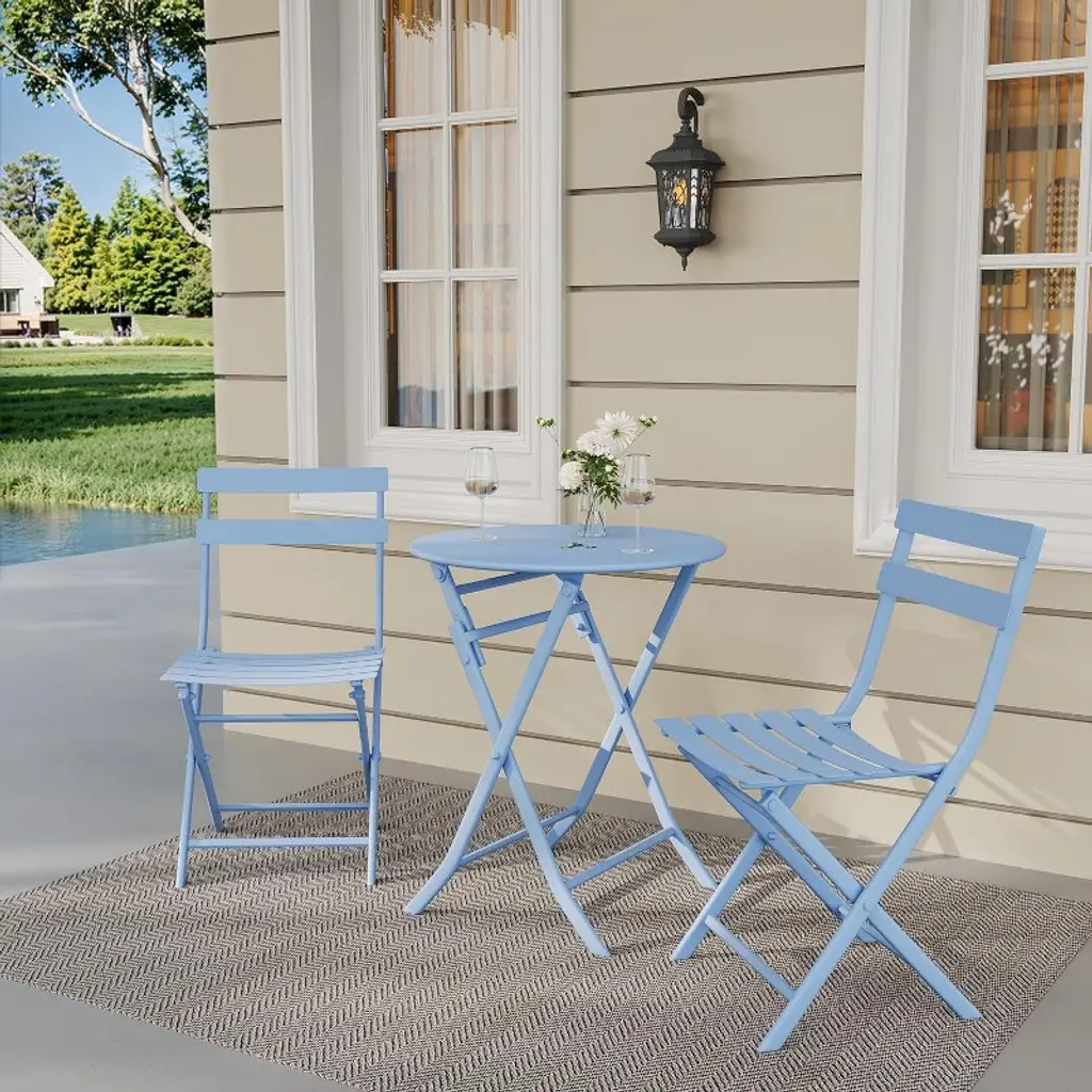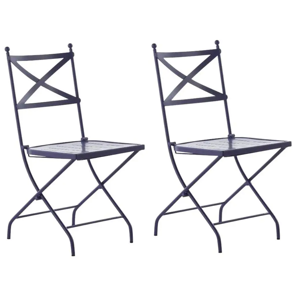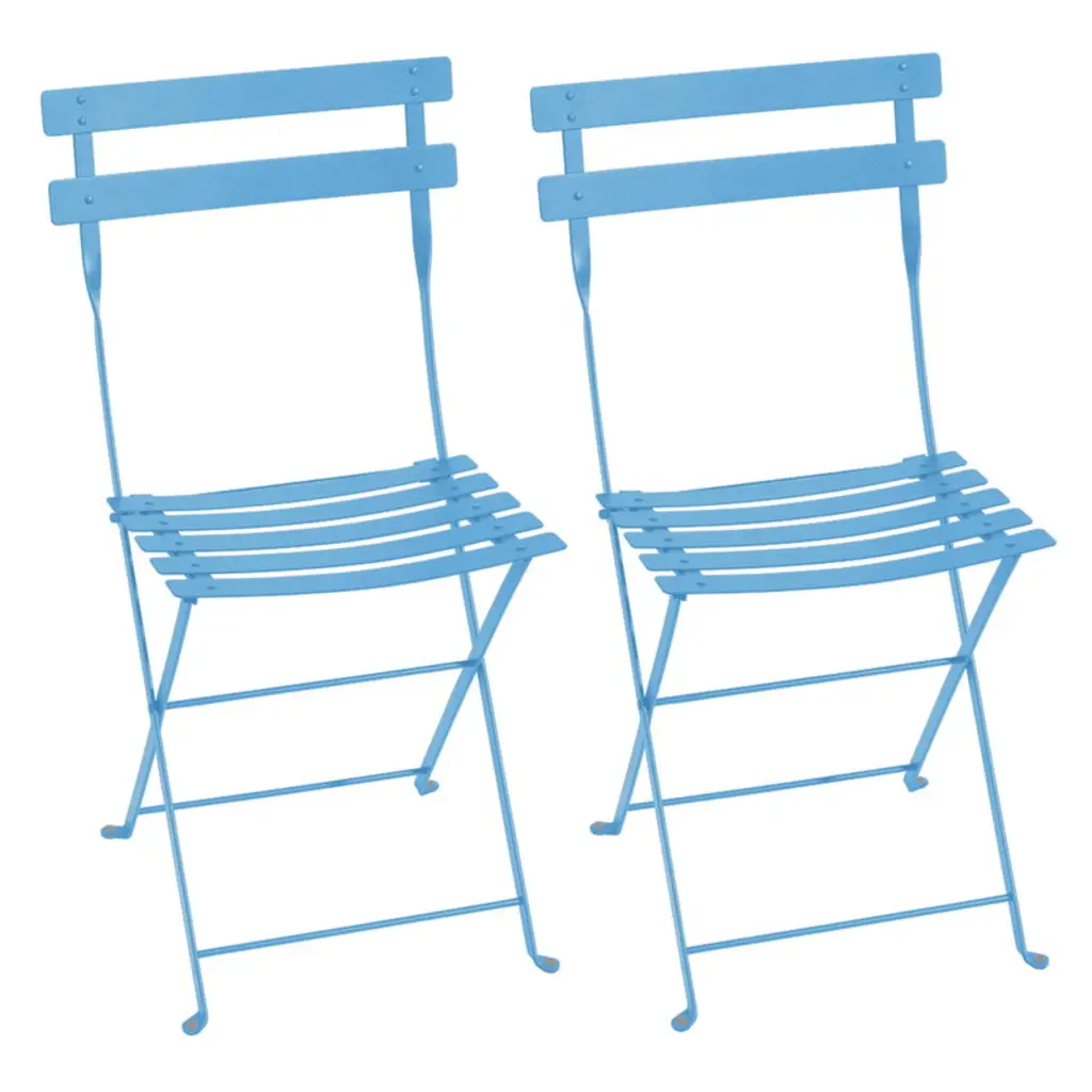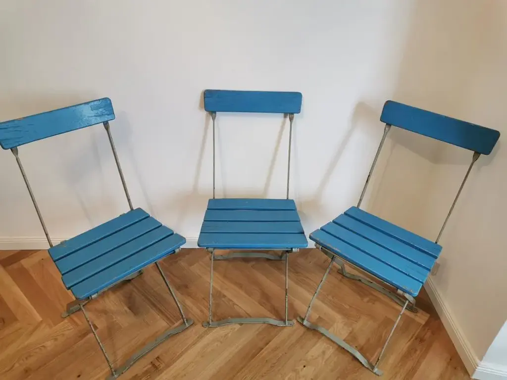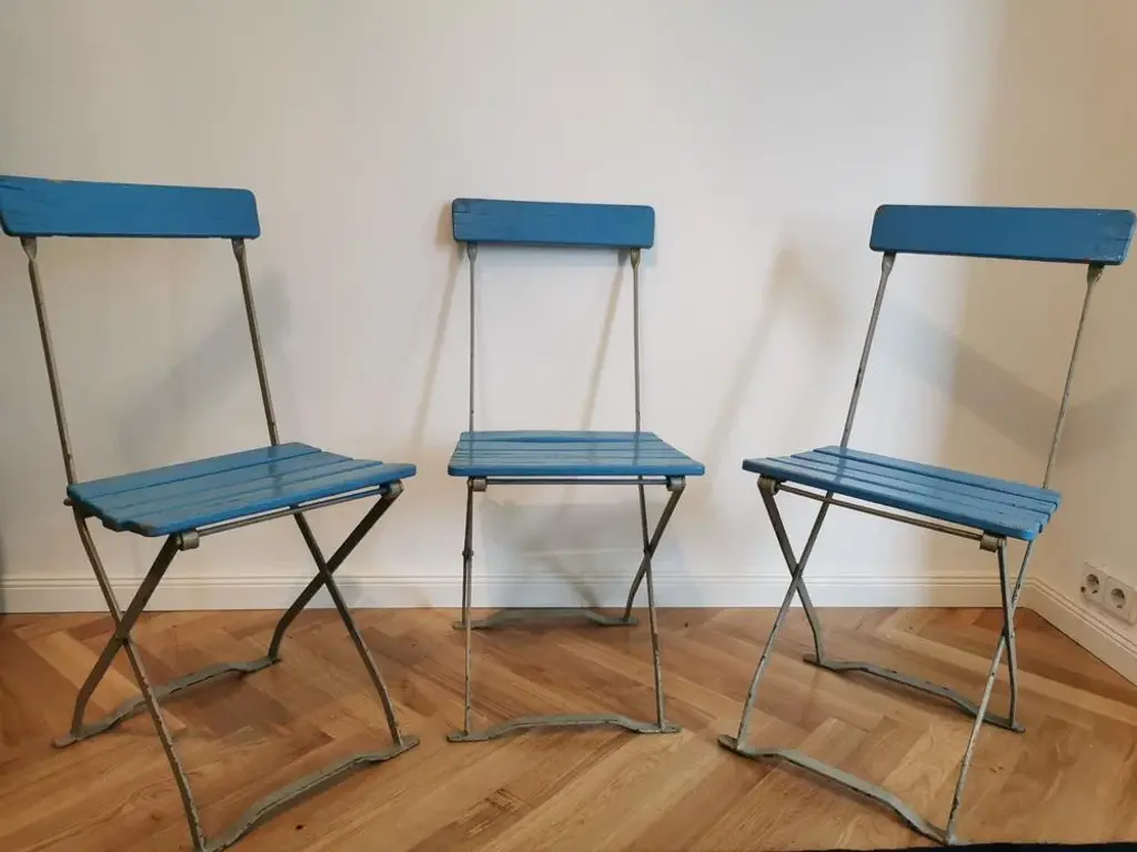 Very robust German beer garden chair, bistro chair, garden folding chair approx. 1920s 1940s, made of 6mm thick blacksmith, seat and backrest made of blue painted oak, seat 40 x 32 cm, seat height 48 cm, height folded up 100 cm, joint rivet. Weight per chair 8 kg.