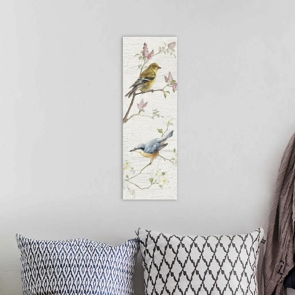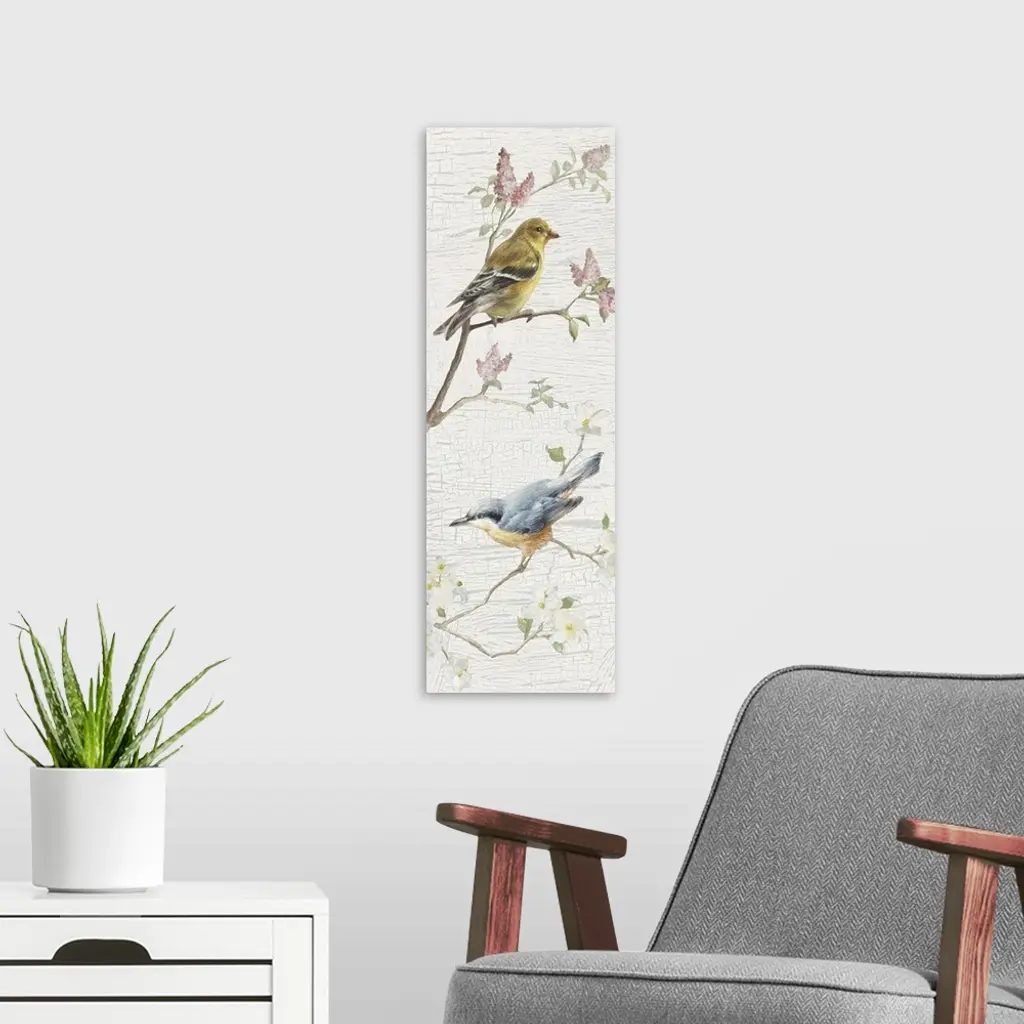 Tall and skinny vertical vintage style illustration with two songbirds perched on branches with a white and gray textured background.