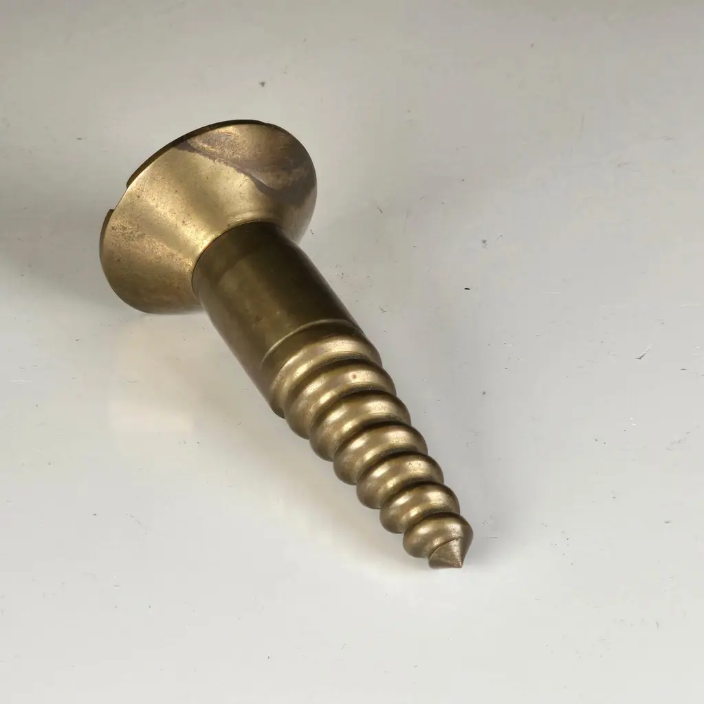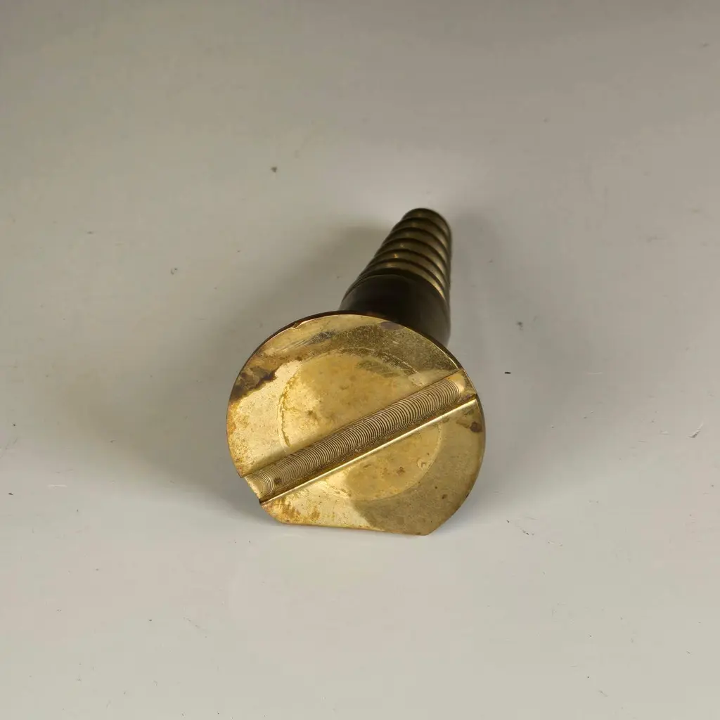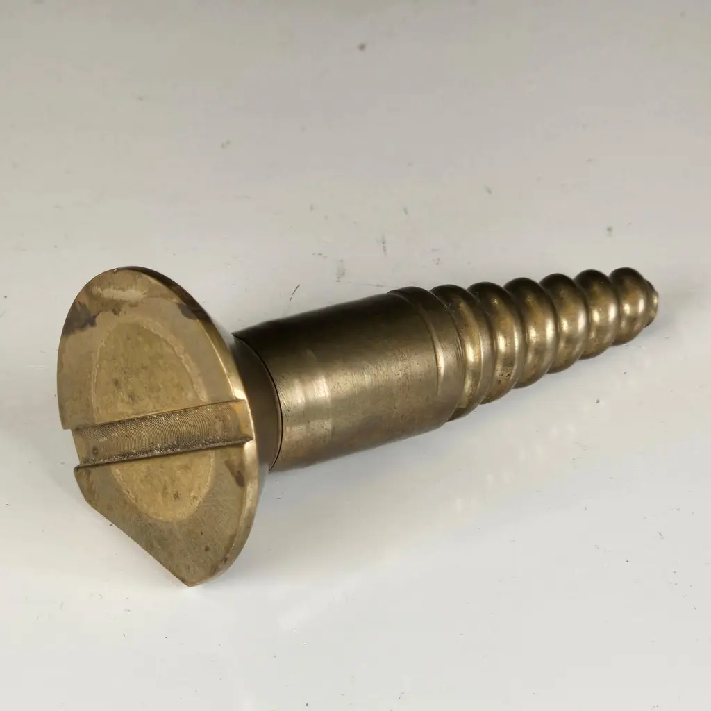 A stylish and subtly subversive cast brass paperweight shaped like an oversized screw, made in the 1960s. Both humorous and functional, this sculptural piece blends the industrial with the artistic in a way that reflects the spirit of Pop Art and mid-century design.During the 1960s, the Pop Art movement—championed by artists like Claes Oldenburg, Andy Warhol, and Roy Lichtenstein—blurred the lines between high art and commercial or everyday imagery. Artists began elevating the mundane: soup cans, comic strips, and in this case, even screws. That cultural shift inspired designers to embrace whimsy and irony, turning ordinary objects into bold design statements.This paperweight is cast in solid brass, with a pleasing weight and a finely detailed thread. It has a flat spot to prevent rolling and functions both as a desktop accessory and a sculptural object. Its exaggerated form and refined materiality make it a conversation piece—an objet d’art that channels the cleverness of Pop and the substance of Brutalism.Ideal as a gift for an architect, engineer, or modern design enthusiast, and can be polished upon request. Its current patina adds character, but a brighter finish is just as striking.