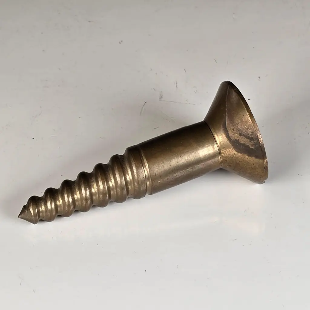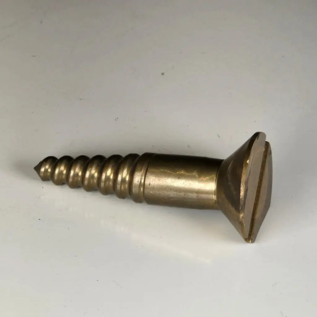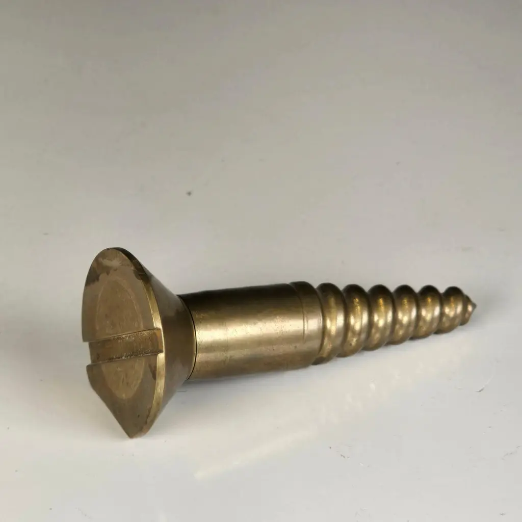 A stylish and subtly subversive cast brass paperweight shaped like an oversized screw, made in the 1960s. Both humorous and functional, this sculptural piece blends the industrial with the artistic in a way that reflects the spirit of Pop Art and mid-century design.During the 1960s, the Pop Art movement—championed by artists like Claes Oldenburg, Andy Warhol, and Roy Lichtenstein—blurred the lines between high art and commercial or everyday imagery. Artists began elevating the mundane: soup cans, comic strips, and in this case, even screws. That cultural shift inspired designers to embrace whimsy and irony, turning ordinary objects into bold design statements.This paperweight is cast in solid brass, with a pleasing weight and a finely detailed thread. It has a flat spot to prevent rolling and functions both as a desktop accessory and a sculptural object. Its exaggerated form and refined materiality make it a conversation piece—an objet d’art that channels the cleverness of Pop and the substance of Brutalism.Ideal as a gift for an architect, engineer, or modern design enthusiast, and can be polished upon request. Its current patina adds character, but a brighter finish is just as striking.