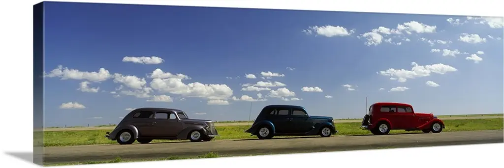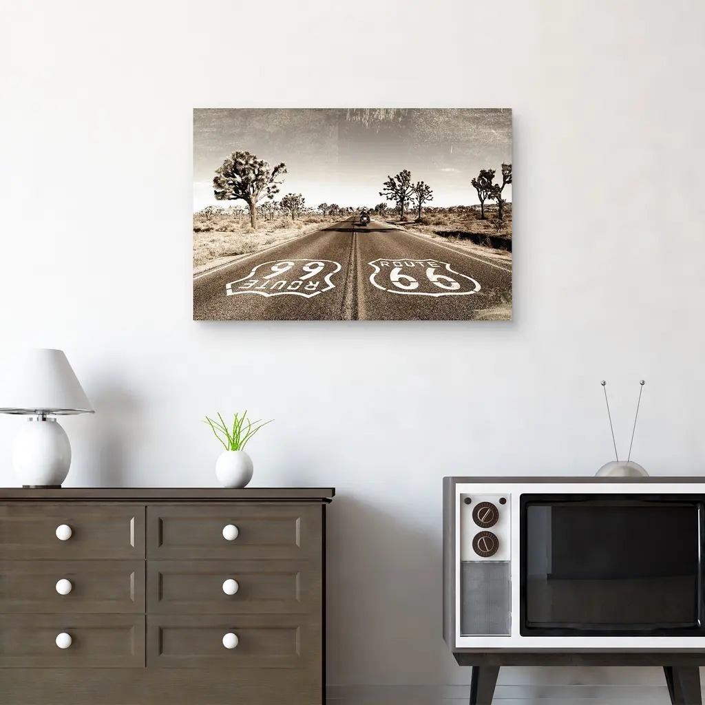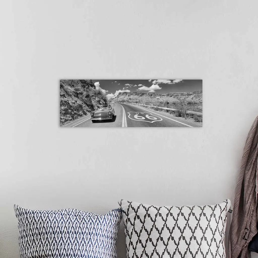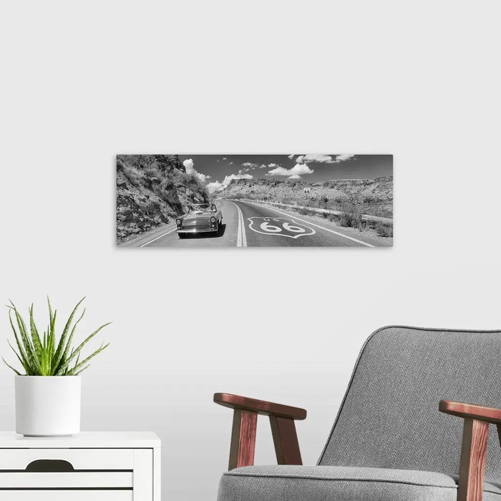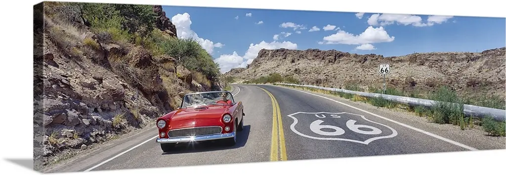 Panoramic photo of a retro car driving down a road on Route 66 in Arizona.