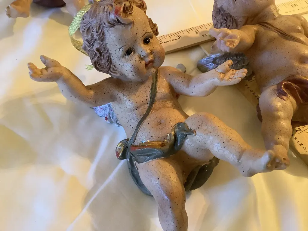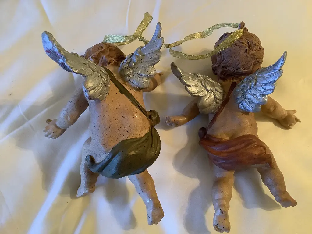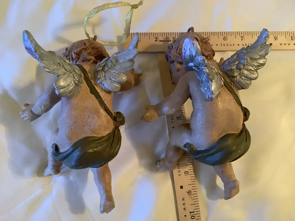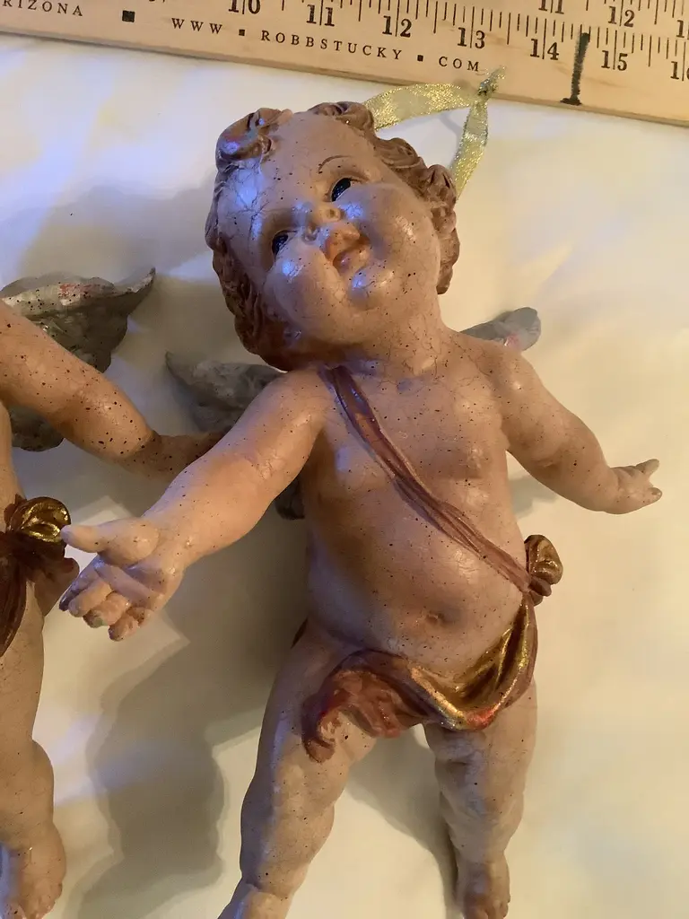 Stunning cherub ornament set. With an aged patina finish. These lovelies were acquired about 20 years ago from a high end Christmas shop. They appear to be a high-end resin composite with the crackled finish and gilt accents. These Italian-inspired cherubs are being sold as a set of 2. There are only 2 sets of 2. Each cherub is approximately 9.5” tall and about 7 inches wide.