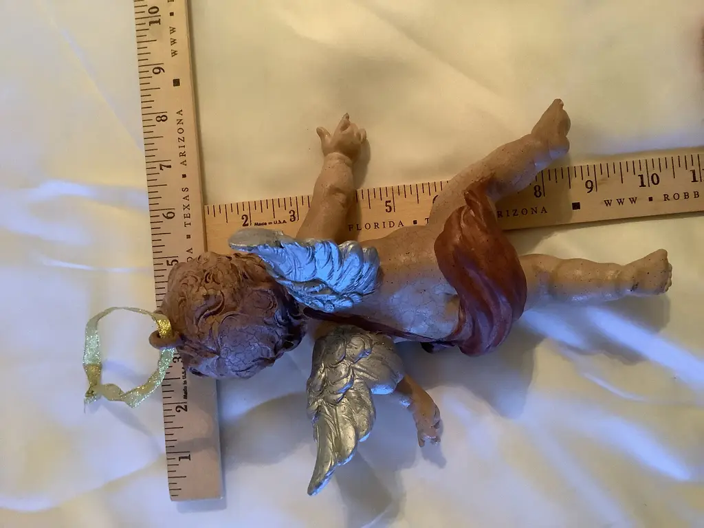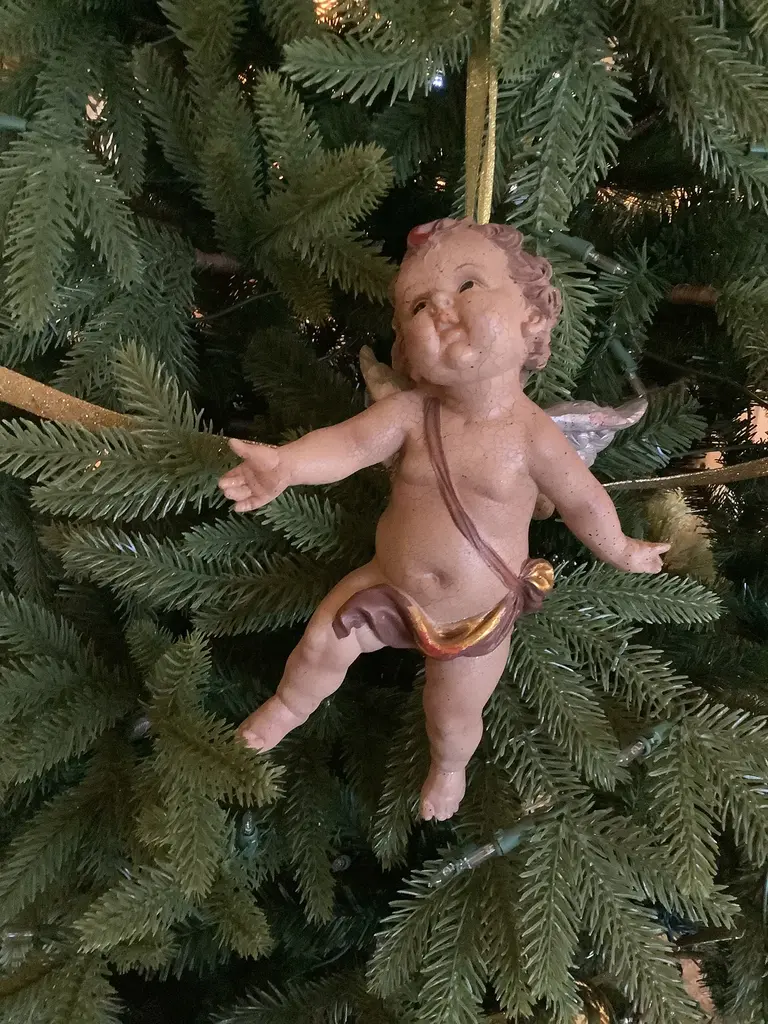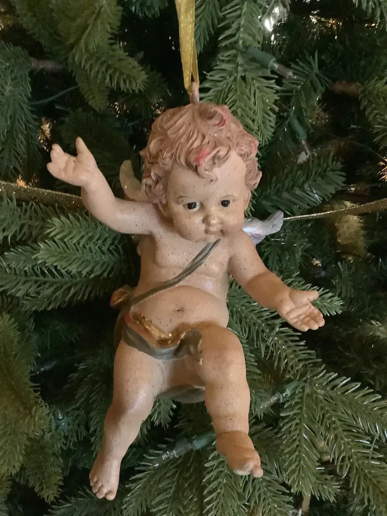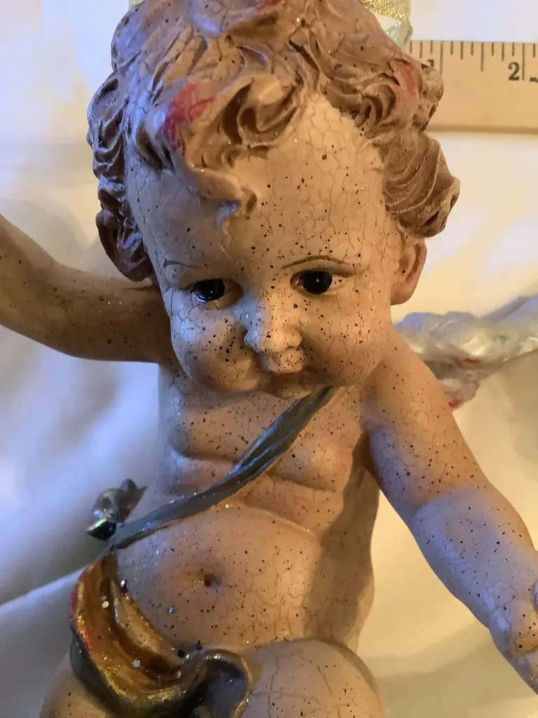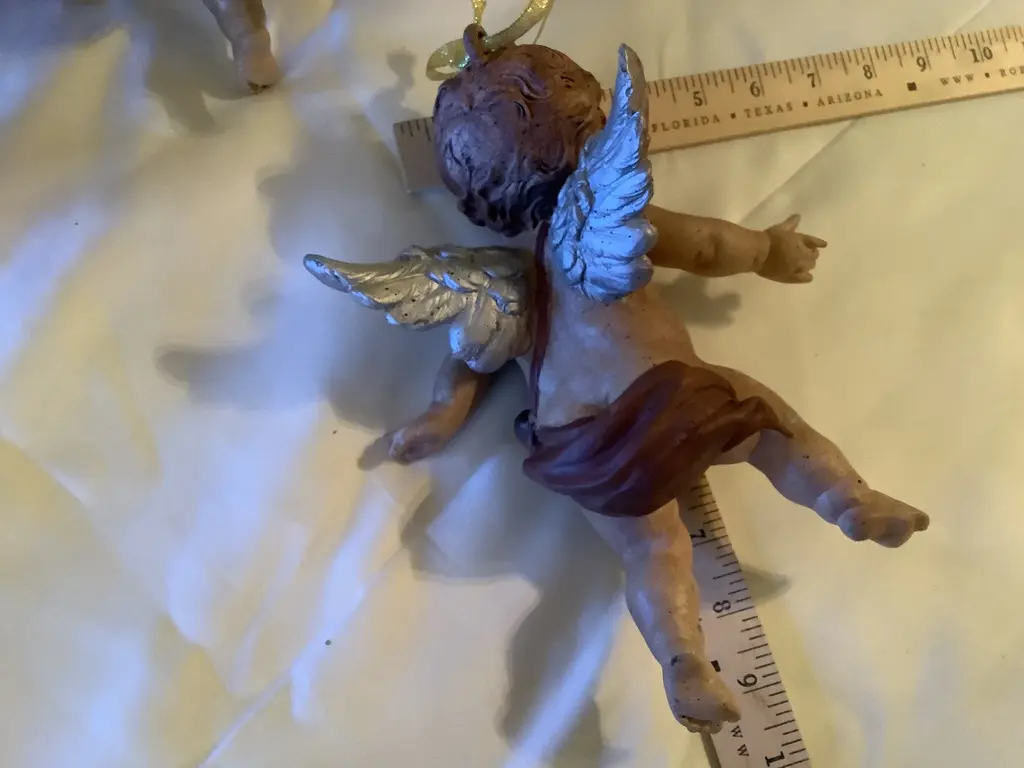 Stunning cherub ornament set. With an aged patina finish. These lovelies were acquired about 20 years ago from a high end Christmas shop. They appear to be a high-end resin composite with the crackled finish and gilt accents. These Italian-inspired cherubs are being sold as a set of 2. There are only 2 sets of 2. Each cherub is approximately 9.5” tall and about 7 inches wide.