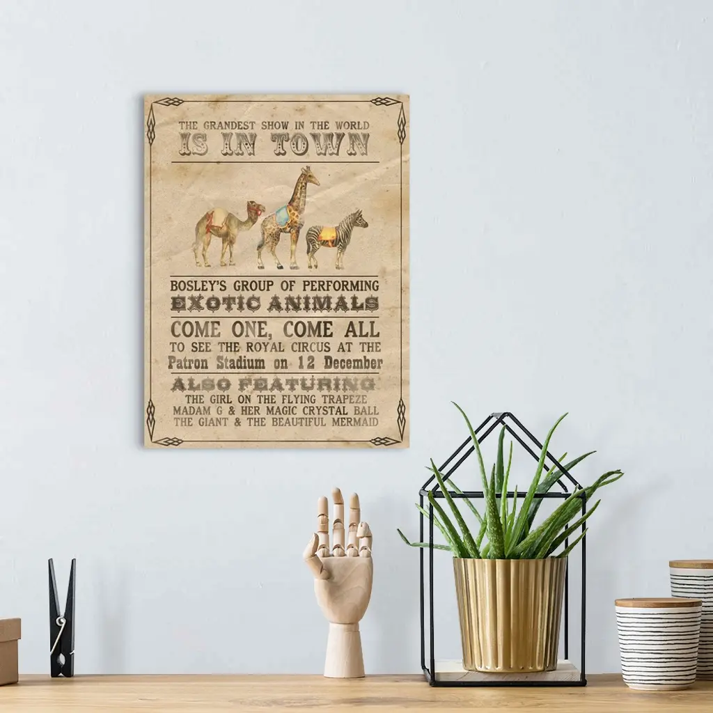 Vintage-style circus poster advertising exotic animals, such as a camel, giraffe, and zebra.