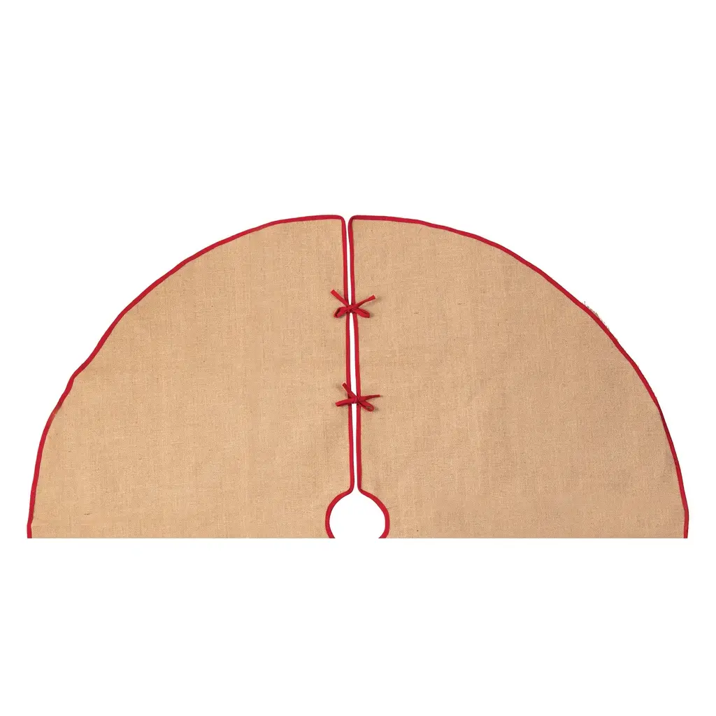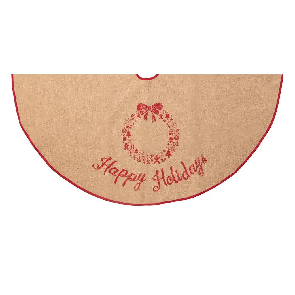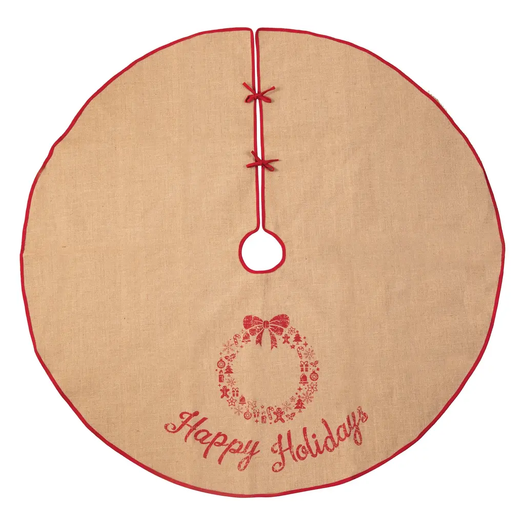 Carry in the Christmas spirit with our Vintage Christmas collection. Sporting warm neutrals and deep red accents, this set is just bursting with holiday presence. The tree skirt portrays a classic red wreath made up of small gingerbread men, candy canes and more. It’s finished off with Happy Holidays printed in cursive. Complete with tie closures, this tree skirt pairs perfectly with its coordinating Vintage Christmas pillows and hooked rug.Hand crafted printed tree skirtCrafted of cottonA tie closure allows you to secure the tree skirt in place underneath the Christmas tree