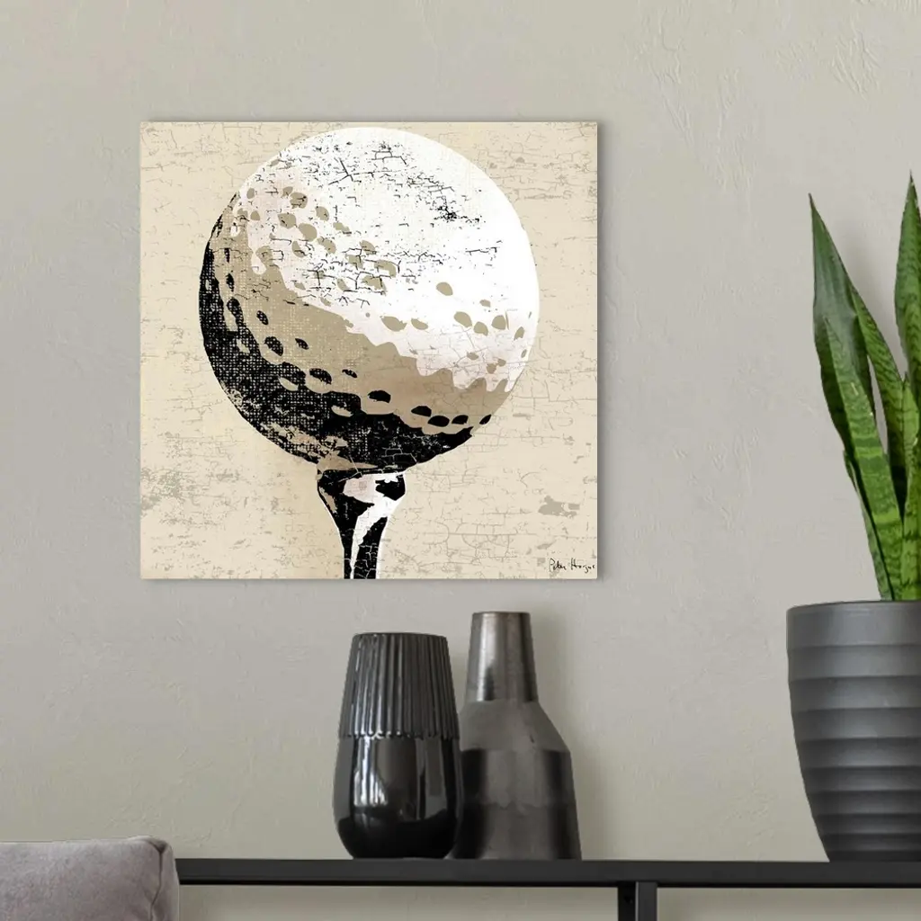 Vintage style wall art of an old distressed golfball on tan and sepia background.