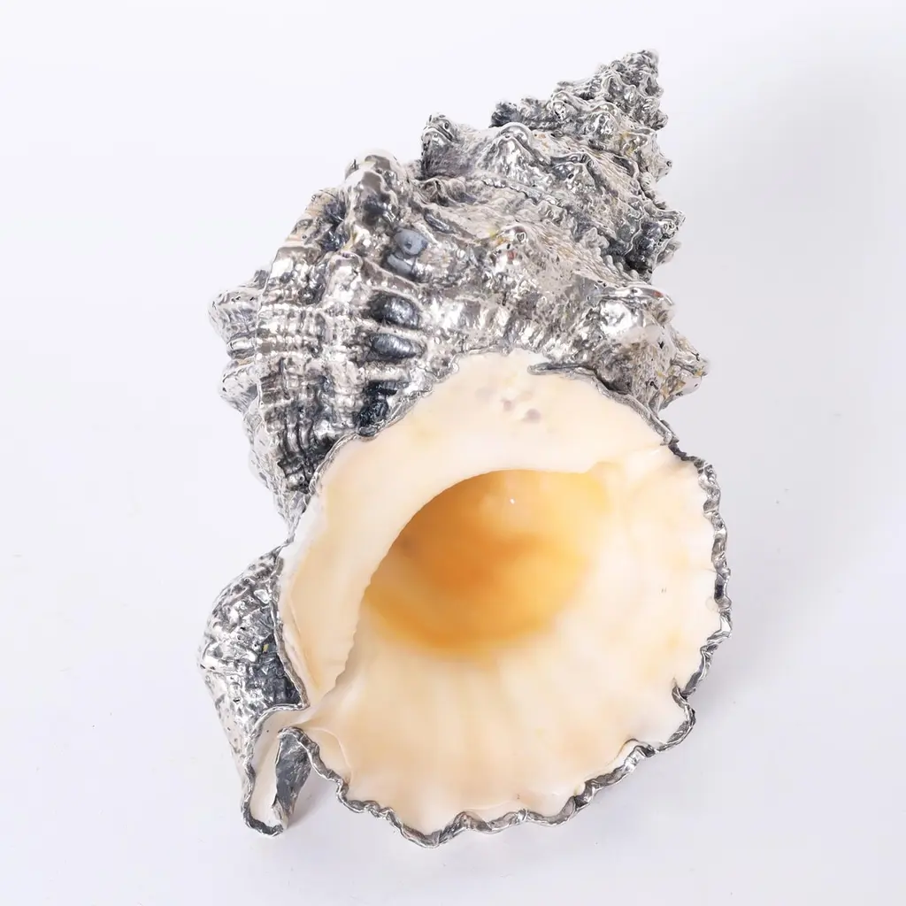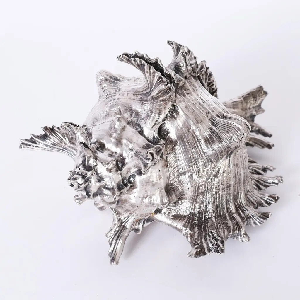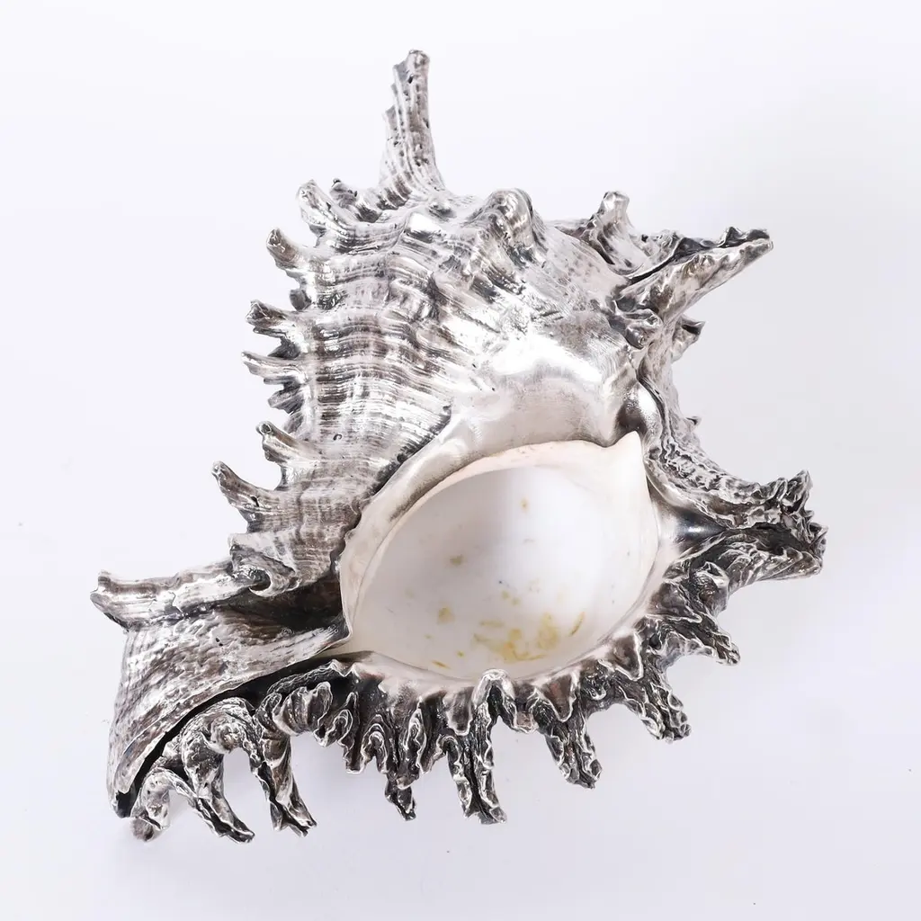 Striking group of five mid century assorted seashell specimens sculpturally enhanced with a silver overlay. Priced individually. Top Left H: 5 W: 8 D: 5.5 $1,450.00 Top Center H: 5.5 W: 9 D: 7 $900.00 Top Right H: 4 W: 7 D: 5 $1,750.00 Bottom Left H: 1.5 W: 4.5 D: 3 $550.00 Bottom Right H: 3 W: 8 D: 6 $1,150.00