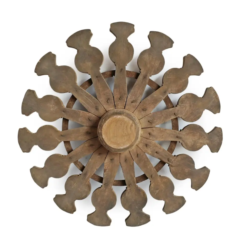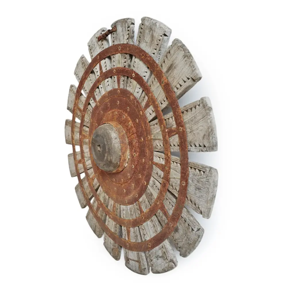 Vintage wood sewing wheel from India. Each is hand crafted is unique in signs of age and use, wood tones, and other details. Measurements may vary slightly. Wonderful displayed as unique wall art. Each is sold individually.