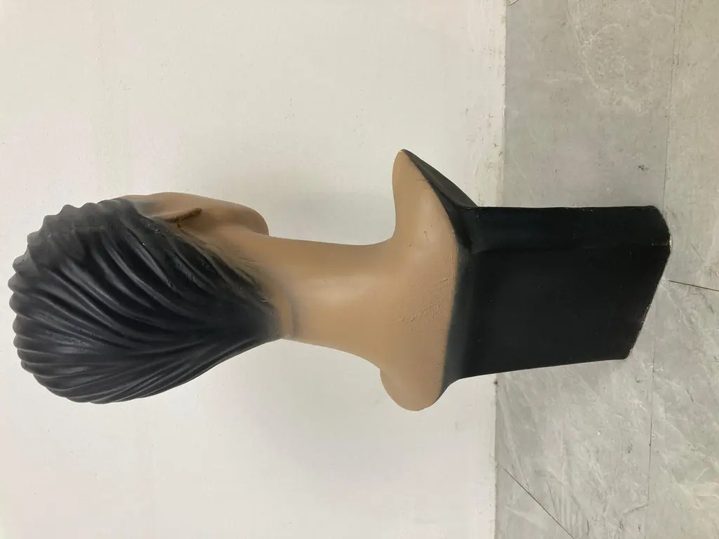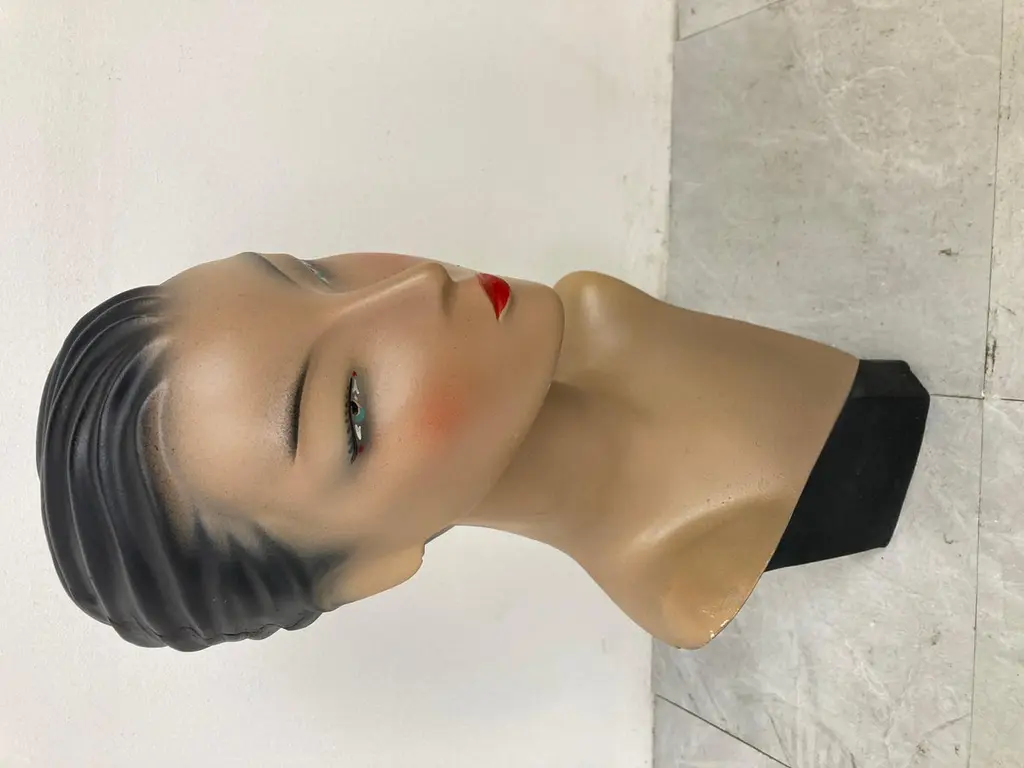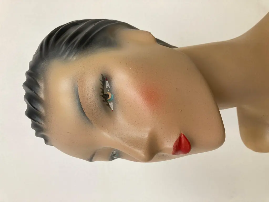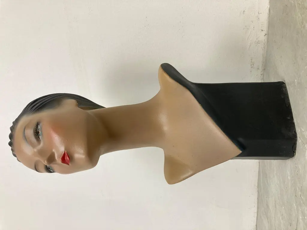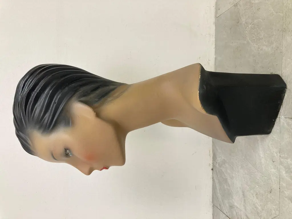 Beautiful female mannequin head made from plaster servings as an advertising bust in a shop.It was used to be displayed at a shopcounter or vitrine.Comes from a lot acquired from a clothes shop that stopped activities.Great decorative item to display glasses, hats,..France - 1960sHeight: 45cm/17.71"Ref.: 654478