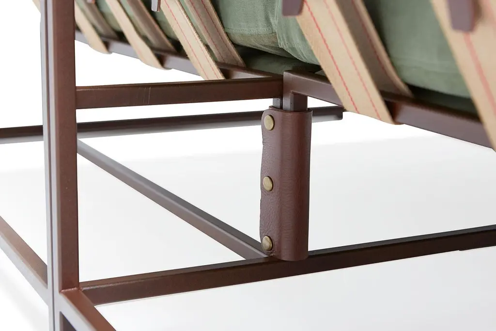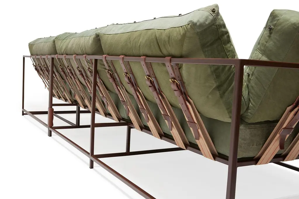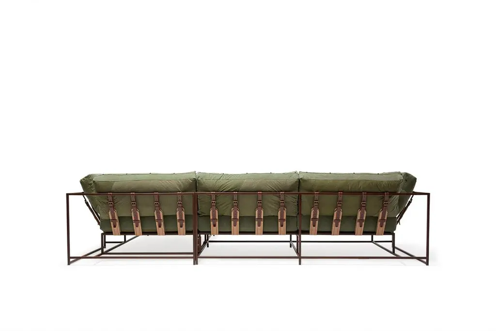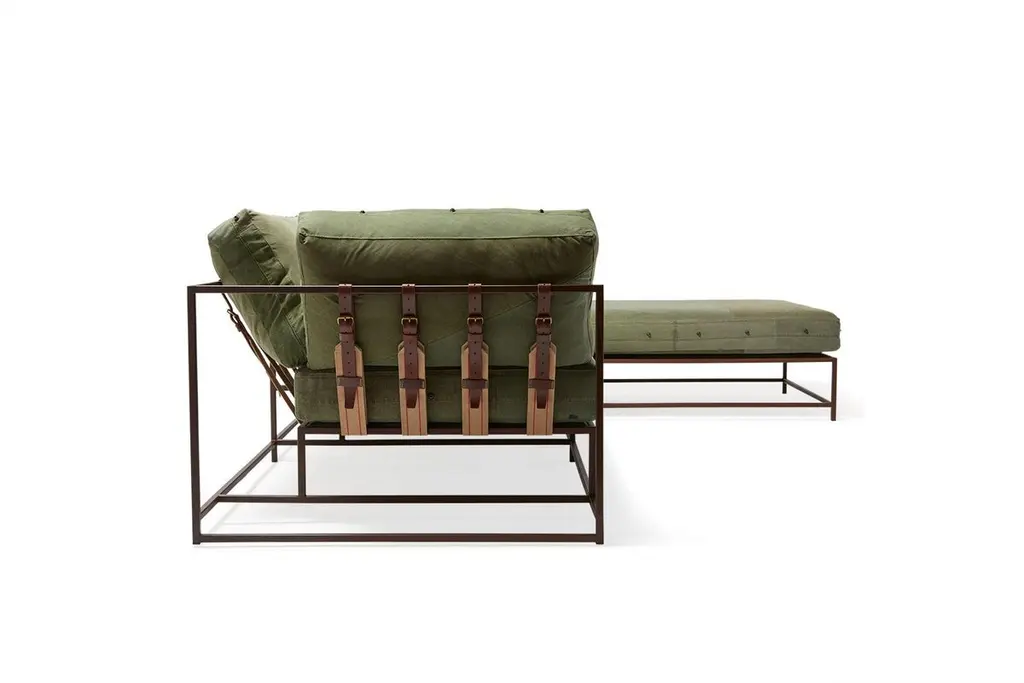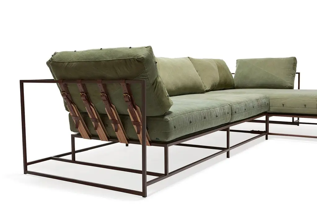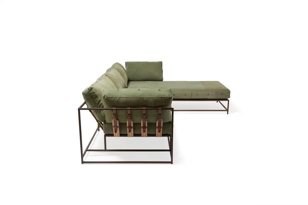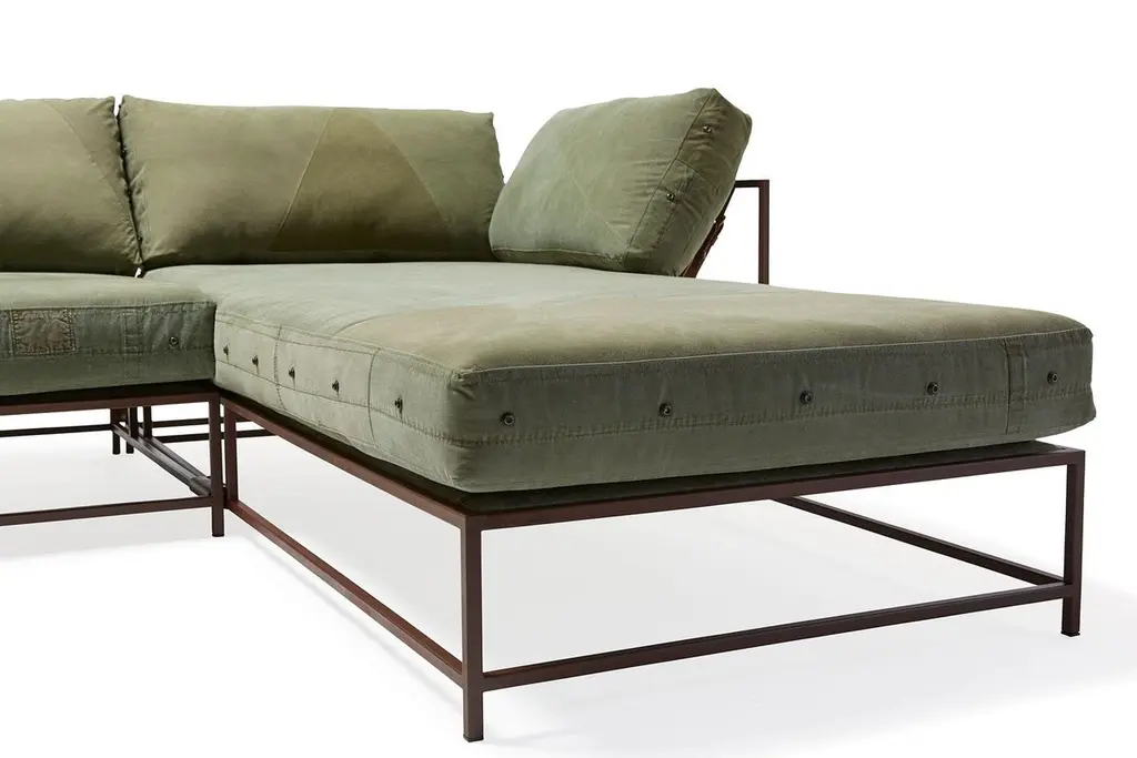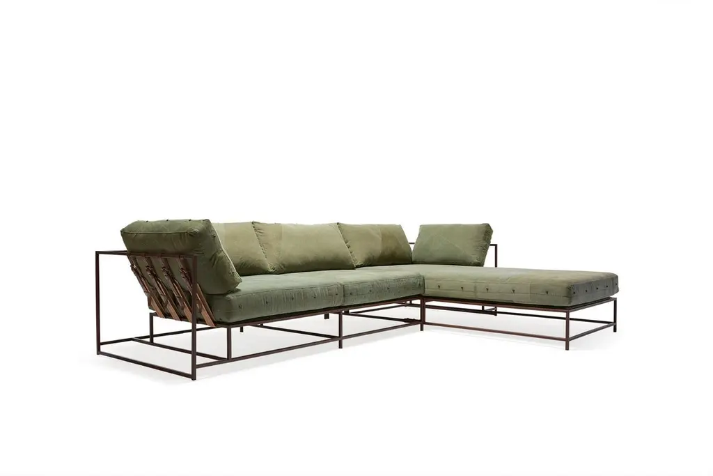 Our sectionals are great ways to customize your space and create the ultimate lounge spaces. Since first designing Inheritance Collection, Stephen Kenn has been inspired by the inherent history in vintage military-issue materials. Each piece of vintage olive green military canvas is distinctive and will have unique markings from its long history of use. The foam seat cushions have been wrapped in polyfiber, allowing for a soft and comfortable lounge experience. Sitting atop a marbled rust steel frame, the piece has support belts featuring Swiss Military style cotton webbing, oxblood leather, and antique brass buckles. This variation is composed of two separate pieces that can be linked together by a coordinating leather cuff, or independently when desired. Dimensions: 126 x 40 x 30 in. Chaise depth 84 in. Chaise width 36 in.Our military canvas is a vintage material, and as such has some small imperfections, stamps, lettering, or markings from the soldiers who used them. We celebrate these imperfections and do not consider them to be eligible for warranty claims. There is also shade variation in olives and greens. Exact color matches are not possible.Every Stephen Kenn piece is made to order through our Los Angeles studio. We create these pieces utilizing a number of small businesses and fabricators in the LA area. We welcome inquiries about custom dimensions or custom material combinations to best fit your space and personal aesthetic.