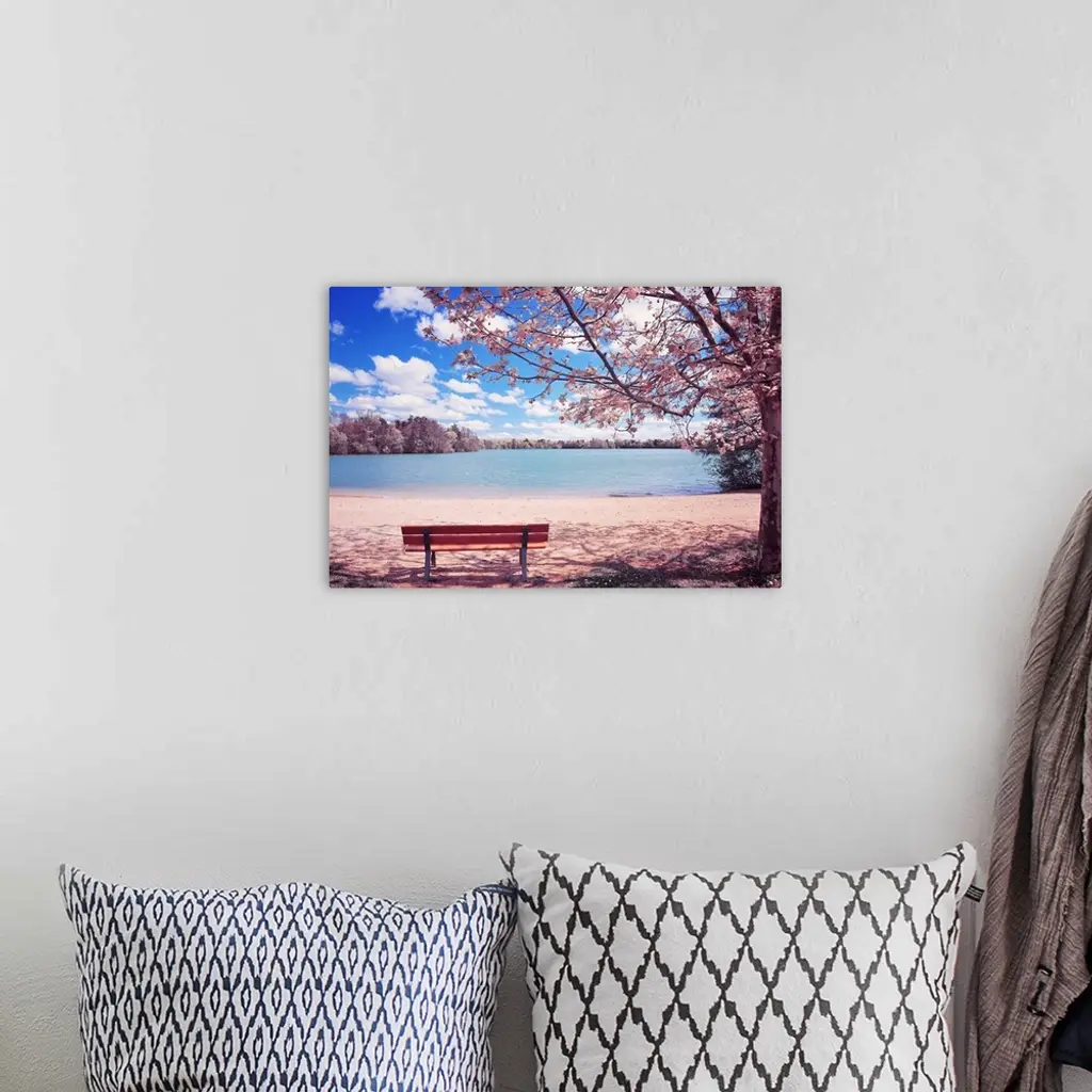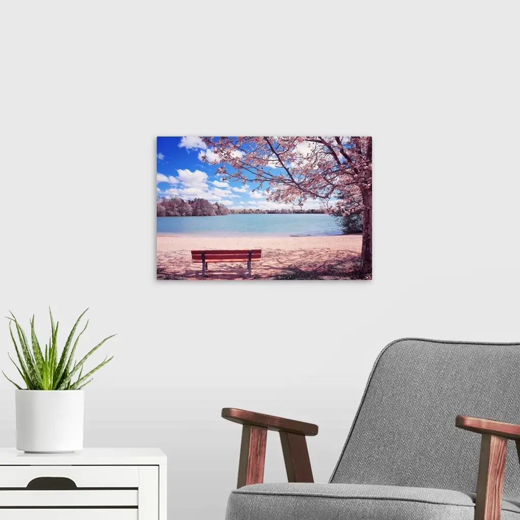 This spring time landscape photograph shows and empty park bench under a blossoming cherry tree beside and lake on a beautiful sunny day.