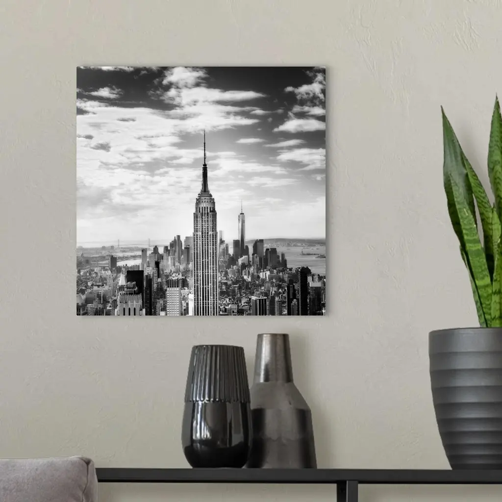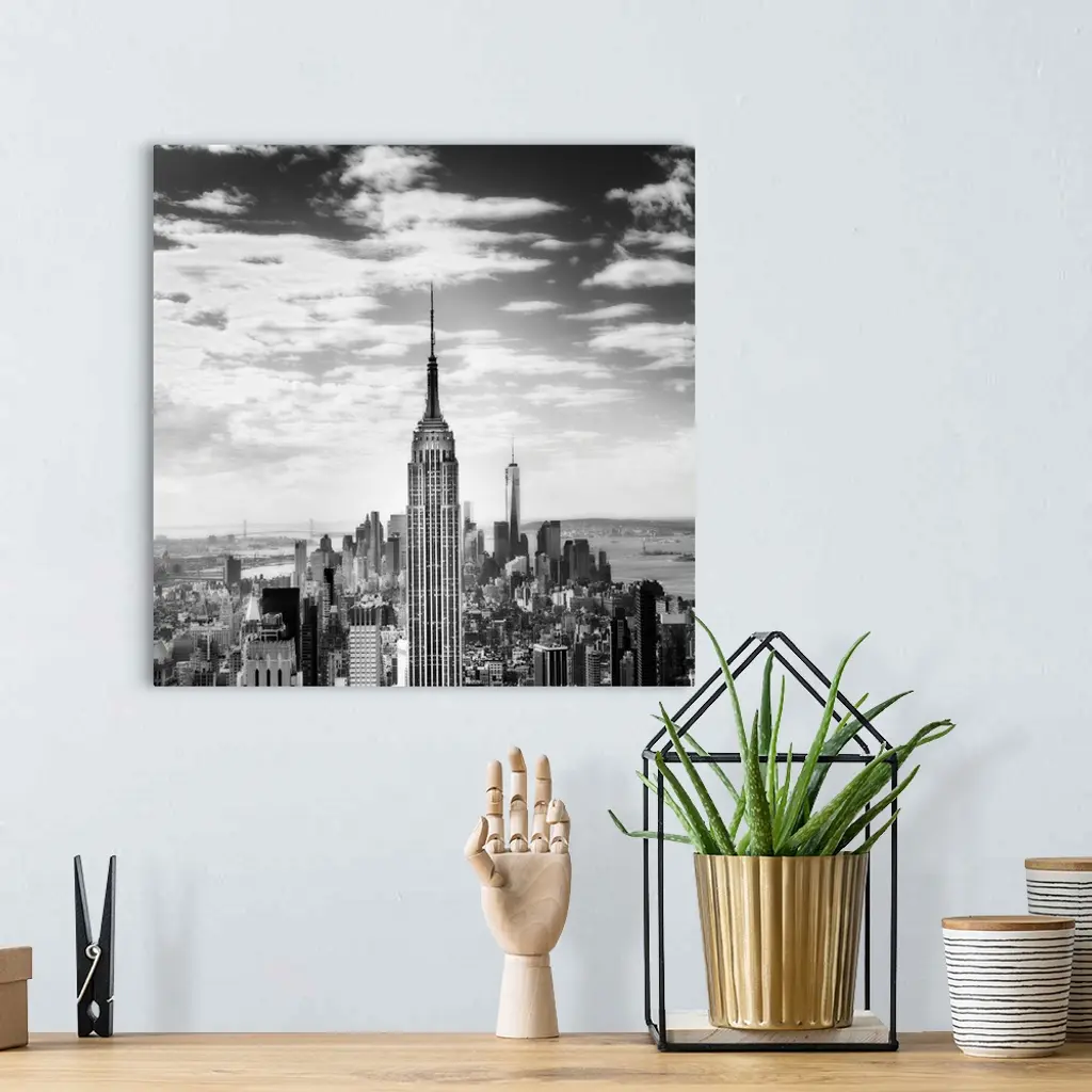 Black and white square photograph of New York City from a bird's eye view, highlighting the Empire State Building.