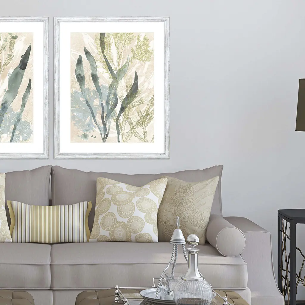 Blue and green seaweed imagery is matted in white. Framed in a whitewash distressed wood with ribbed face.