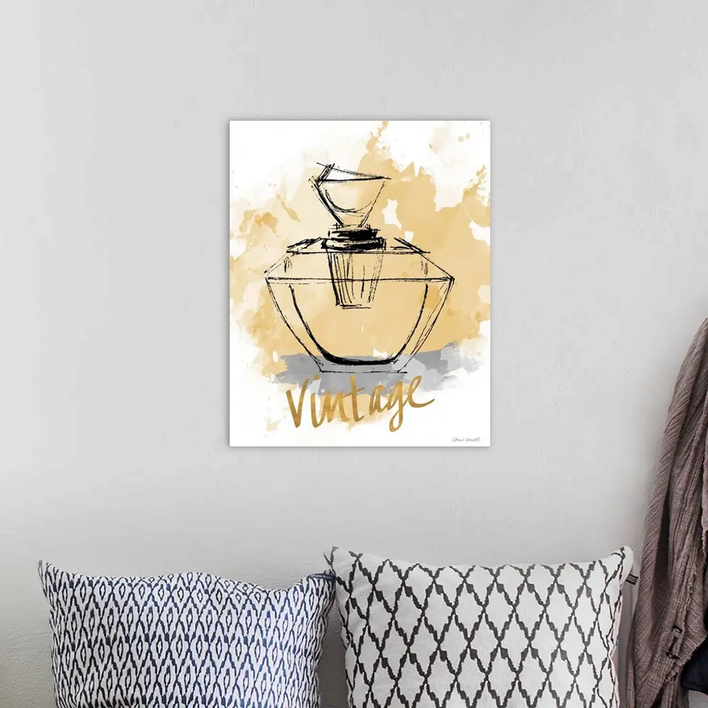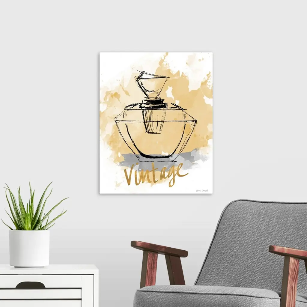 Black outline of a perfume bottle on a gold paint splatter background with the word "Vintage" written at the bottom in metallic gold.