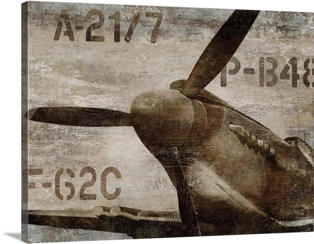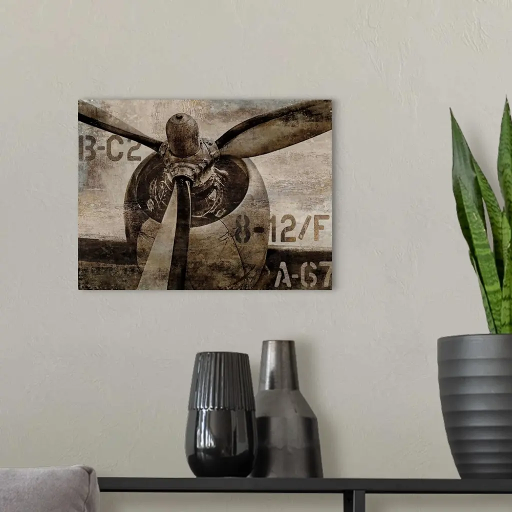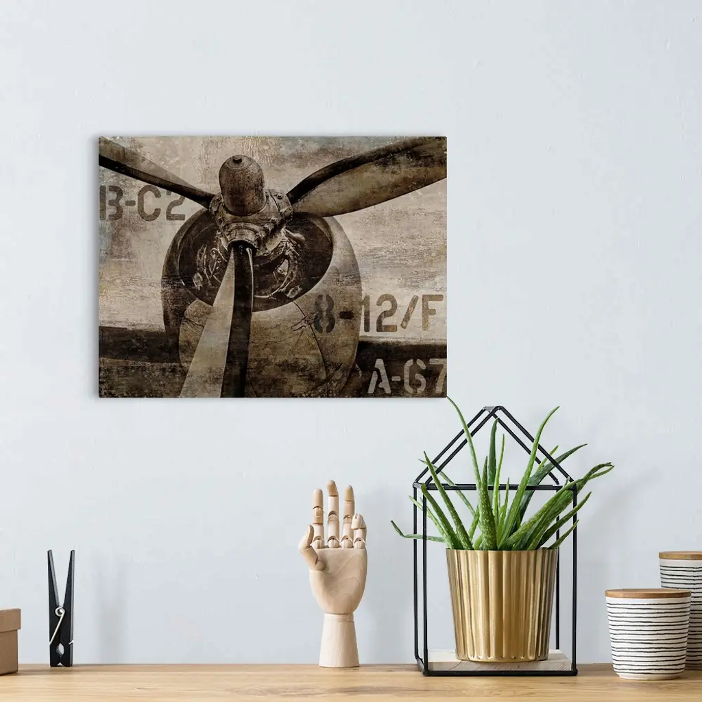 Vintage decor with an illustration of an old airplane propeller in dark sepia tones.