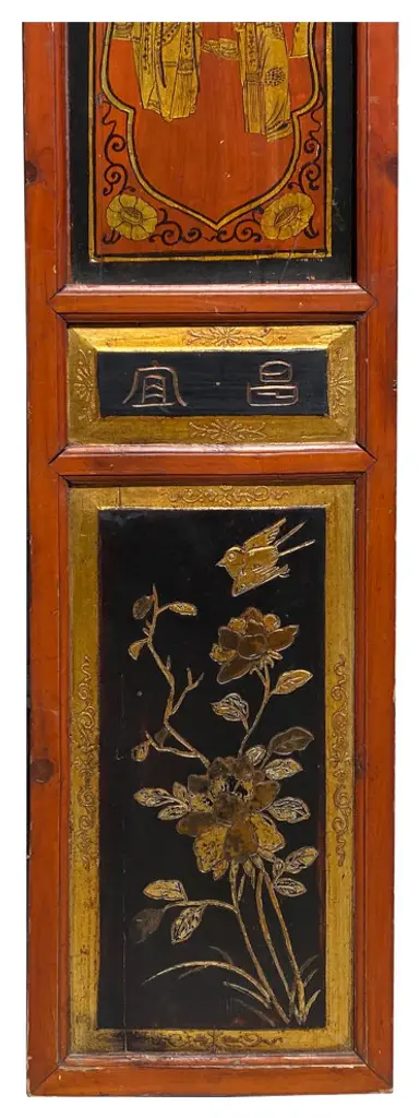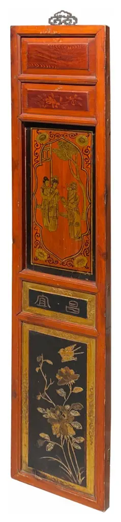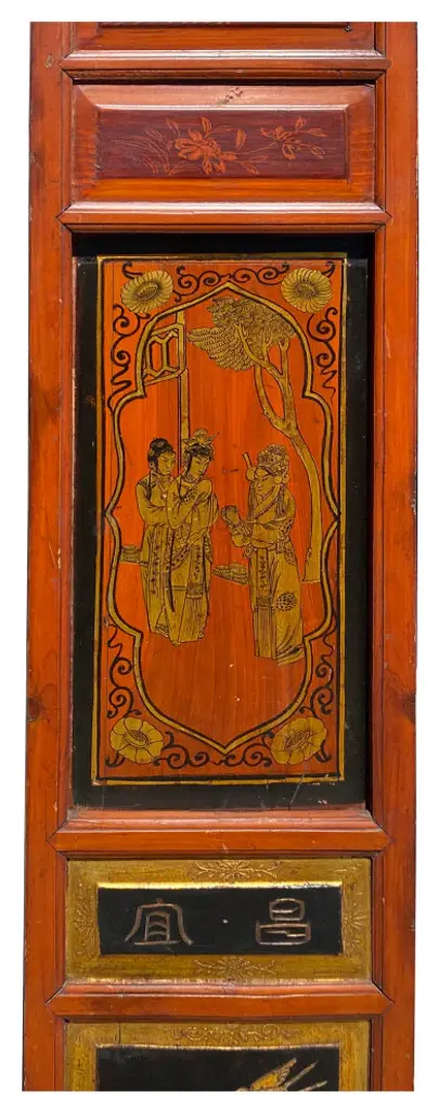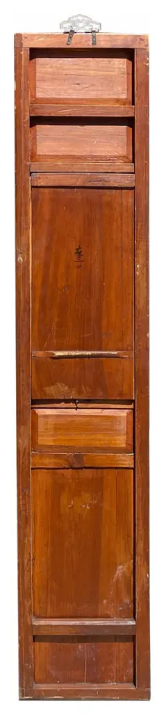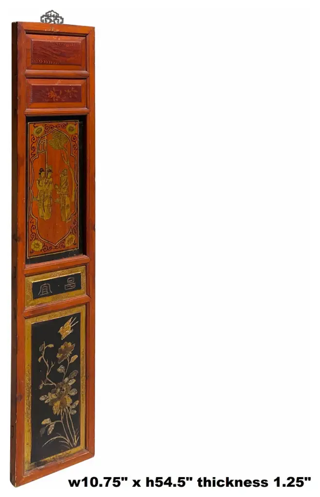 This is a restored wood decorative panel in medium brown stain color. There is handpainted oriental Chinese scenery in golden color. It has been restored and chip marks. It can be mounted on the wall, built into a room divider, or framed adding a hinge.Dimensions: w10.75" x h54.5" thickness 1.25"Origin: ChinaMaterial: Elm WoodCondition: Restored, marks, repainted on the base color.