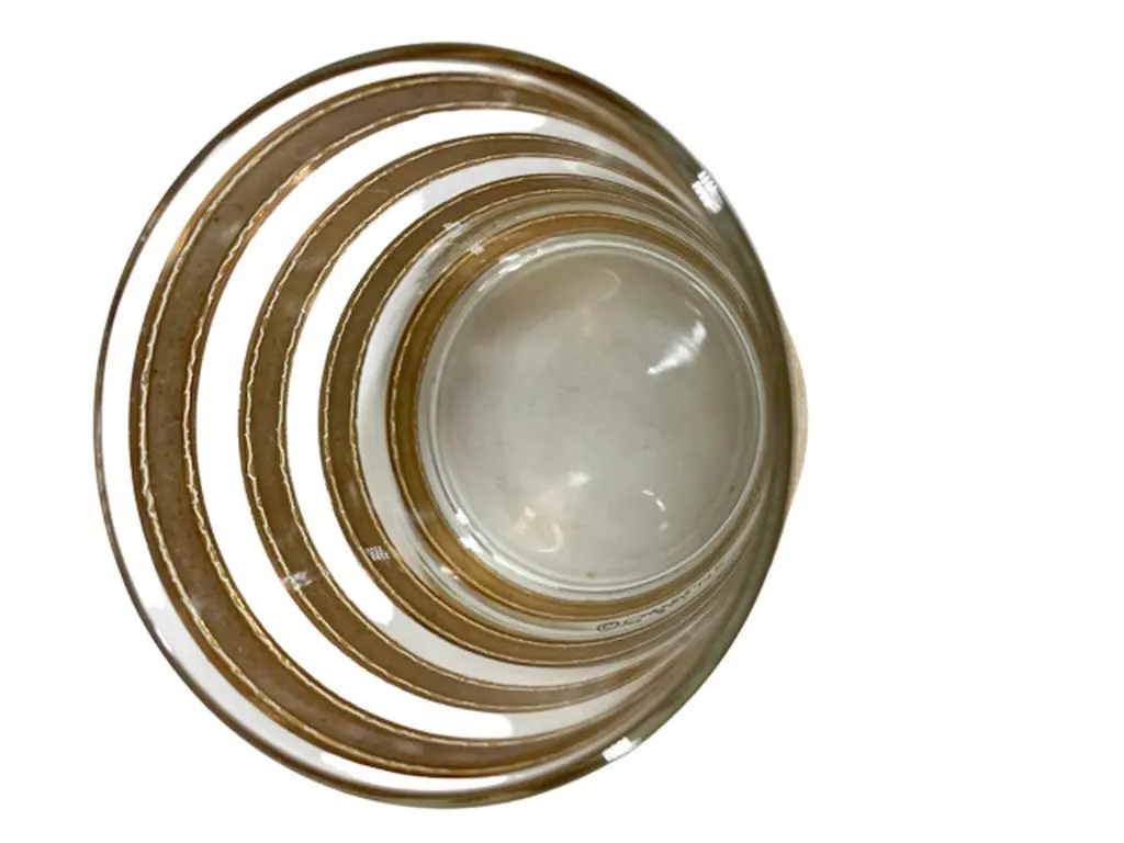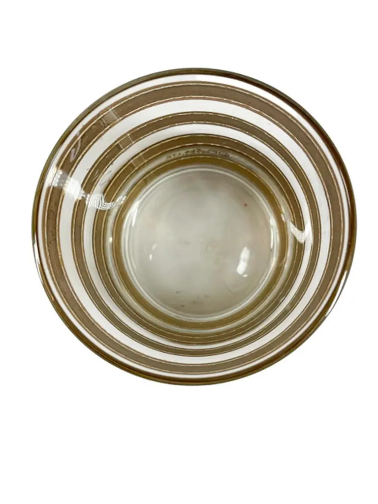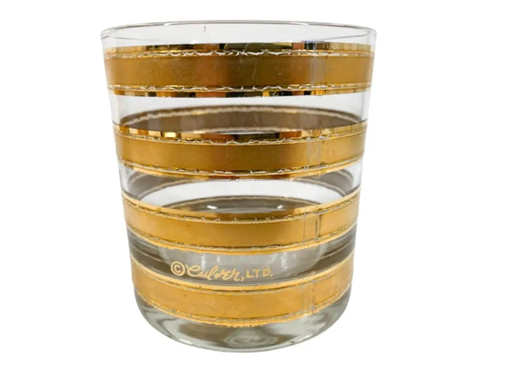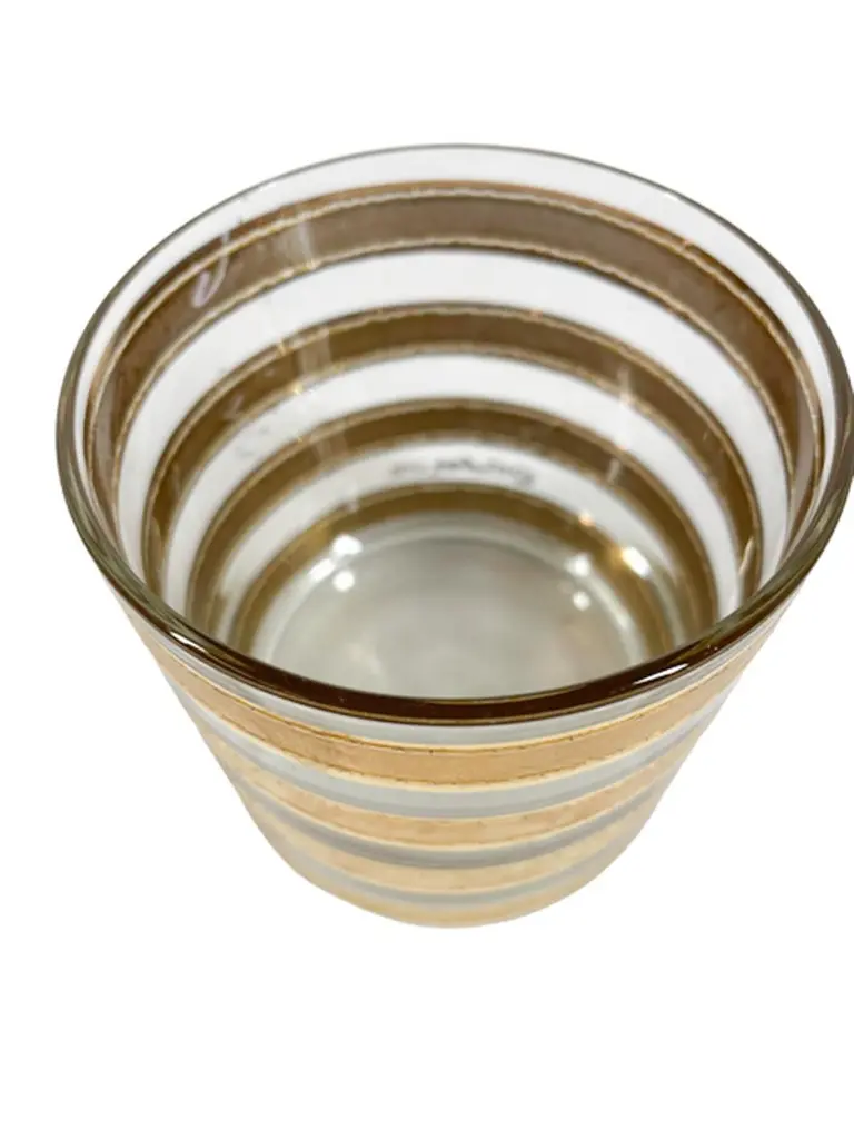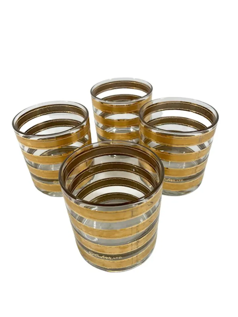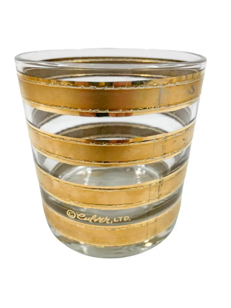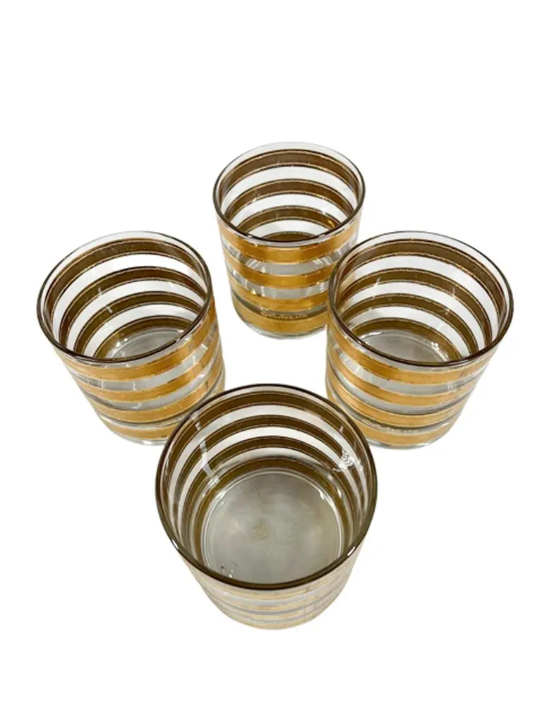 Mid-Century Modern rocks glasses by Culver, LTD. decorated with 22k gold in the "Regiment" pattern. Each Glass with wide satin finished gold bands with raised and textured edges.
