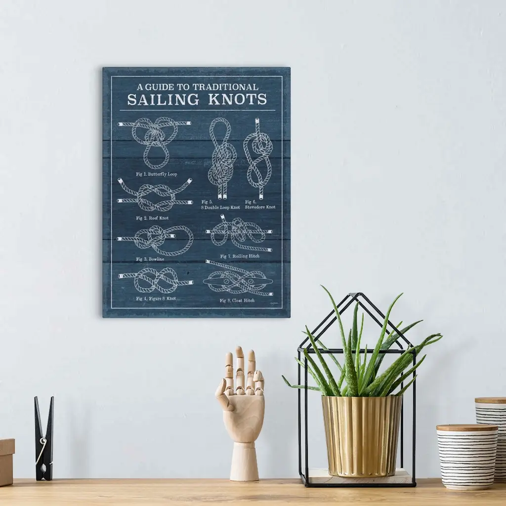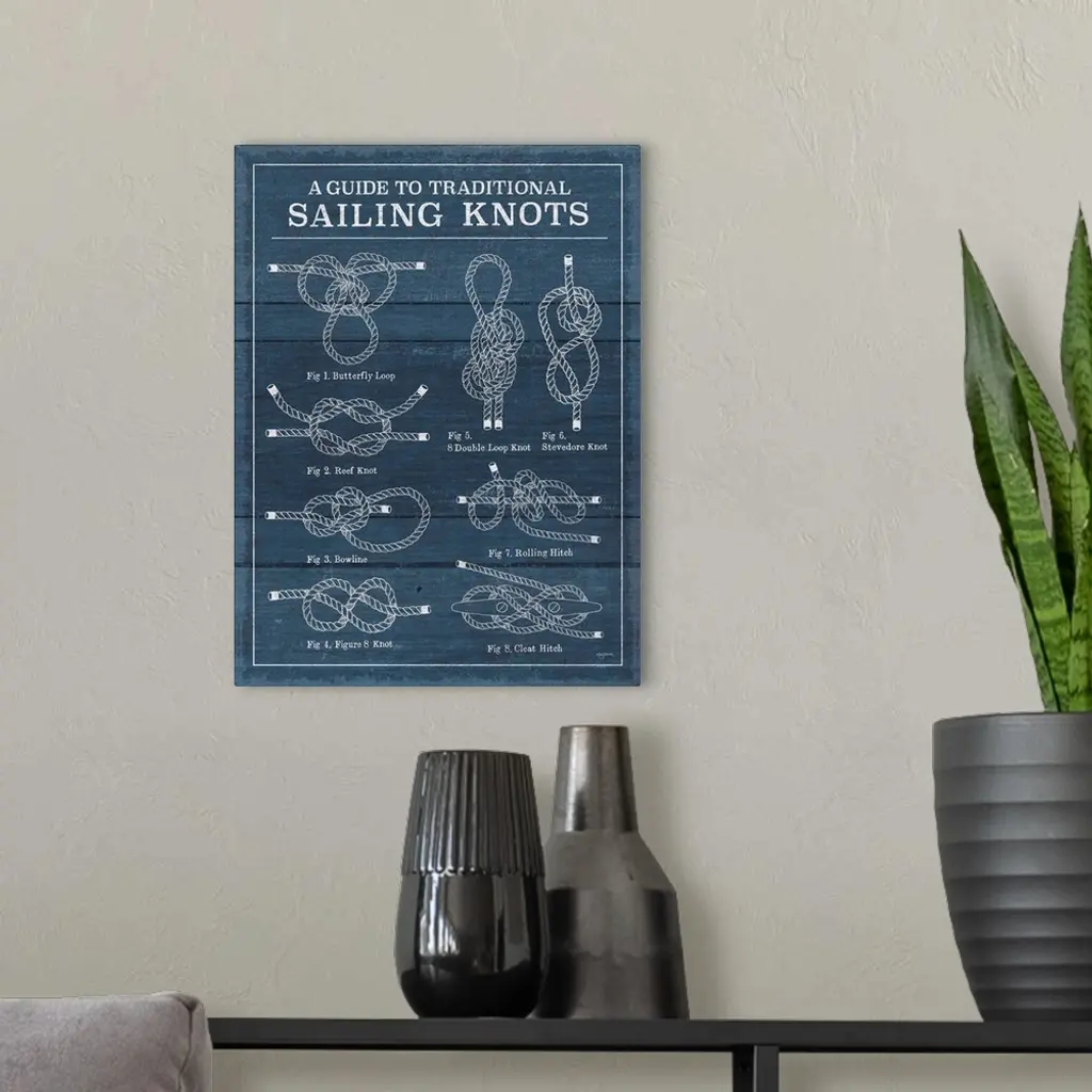 "A guide To Traditional Sailing Knots" Diagram of various sailing knots on a textured blue background.