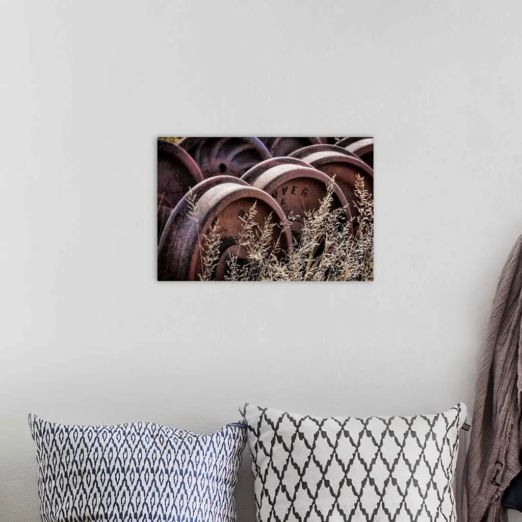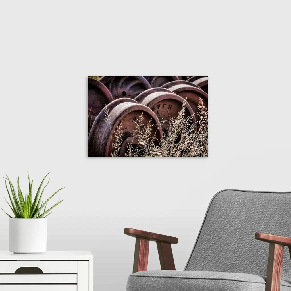 Photograph of old train wheels in the grass.
