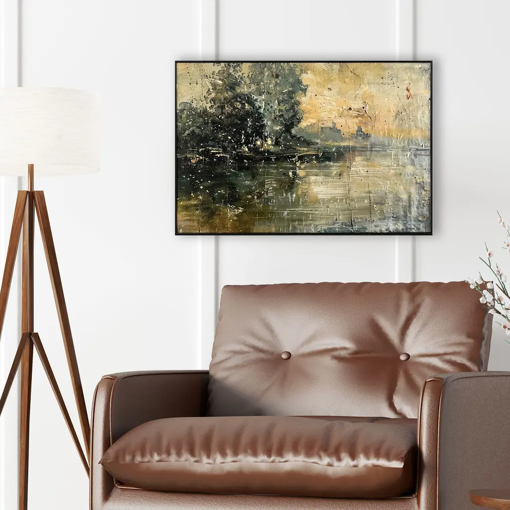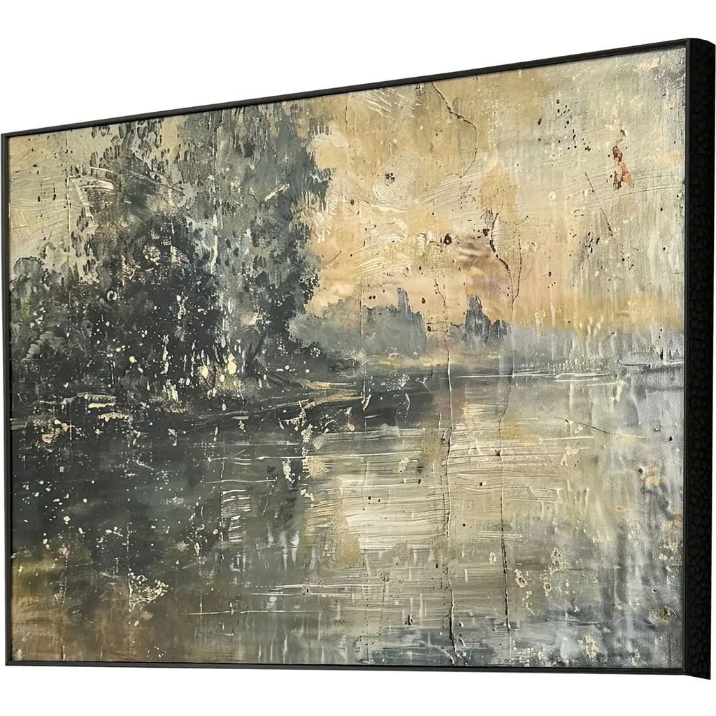 An aged landscape features a hand applied enhanced gel finish. Dimensionally framed in a matte espresso wood with honeycomb embossing.
