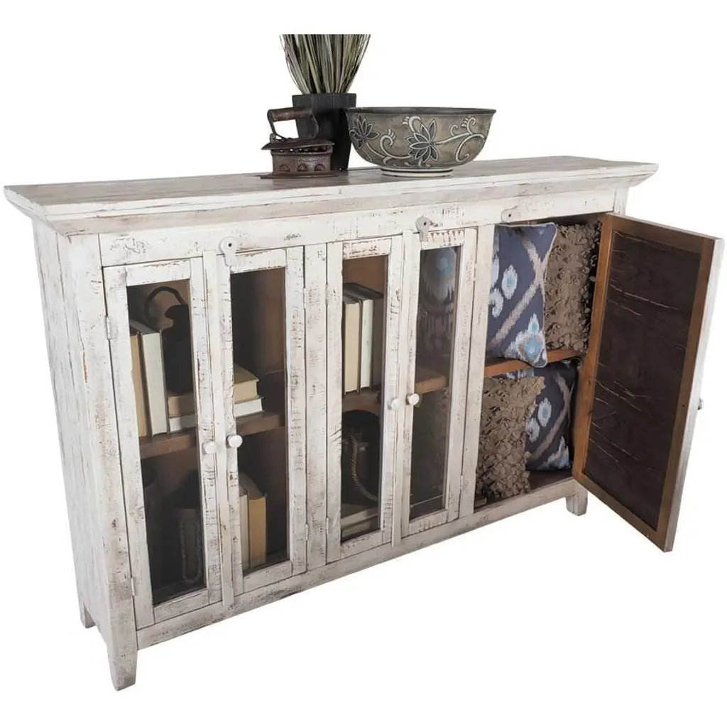 The Isabella vintage white 72" curio console by Nero Lupo bring old world craftsmanship and antique styling to almost any room in your home. The sturdy solid wood construction is distressed and adorned with a hand-applied antique white rubbed finish. This quality accent piece is perfect as an entry piece, display case, buffet server, TV stand or audio / video cabinet. This multi-function piece is just waiting for your imagination to make it uniquely yours!