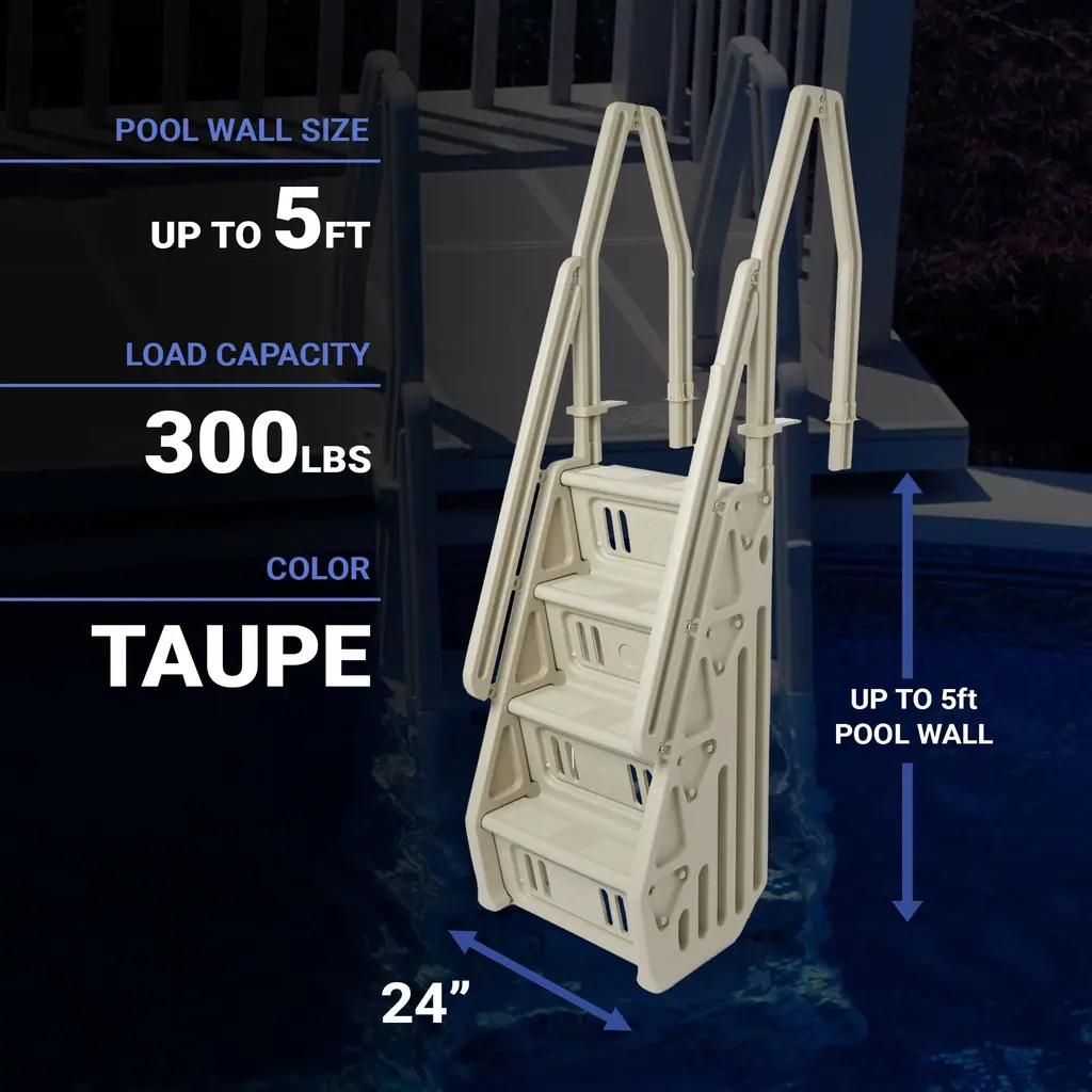 We've all seen the hilarious home videos. There's an above-ground pool, a trampoline, and a knucklehead lying on the ground that wasn't quite able to bridge the gap between them. Getting into your pool should be the beginning of a relaxing afternoon, not the groundwork for more headaches. With the Vinyl Works IN Adjustable Above-Ground Pool Ladder, installing a safe and convenient entry to your backyard oasis certainly won't include any back-breaking work -- unlike the plans of the pool owners in those viral videos. With its versatile and stable design, this adjustable swimming pool ladder can fit comfortably over the walls of your above-ground pool to provide safe entry into the water for all ages. The two rails are set 24 inches apart and offer a sturdy support for those with pulling themselves up out of the water. And you might think this submersible pool ladder would be extra slippery for wet feet, but each step has a textured surface to easily grip while getting in and out. Whether your pool is large or small, this inclined design is going to give you more room to swim and splash with a 22-inch footprint that sturdily sits vertically against any of the perimeter walls. With the ability to adjust to a maximum height of 60 inches, it features 4 wide steps that can be both ascended and descended comfortably. The deck flanges at the top of this pool ladder have the hardware to bolt into your pool deck and support up to 300 pounds at a time. With its heavy-duty plastic resin construction and stainless steel hardware that will not rust with constant use in the water, this system is built to stand up to everything a long, hot summer can throw at it. With only a few tools needed to assemble the prefabricated pieces, this ladder will be ready to make your pool more accessible in no time. Don't give your friends and family the opportunity to end up in a viral video on their way into your backyard pool. Step-in pool ladder with double handrails for easy, safe entry and exit into an above-ground pool Designed and intended for use with an above ground pool with up to 4.5- to 5-foot side walls and a flat bottom 2 deck mount flanges for greater stability offering a 300-pound load capacity for one user at a time Top-step platform adjusts from 44 to 60 inches tall to pass over pool walls and the ladder is 24 inches wide Includes both deck mount flanges and front mount flanges (with hardware) that can be used to mount directly to a pool deck Two rails are set 24 inches apart and offer a sturdy support for those pulling themselves up out of the water Smoothly rounded base allows step to be stable and not damage the pool liner Constructed of maintenance free plastic resin and stainless steel hardware Minimum obstruction of swimming space with a footprint of only 22 inches within the pool Step system is designed to prevent entrapment while allowing great circulation of the pool water All stair treads have been designed with a non-slip surface for safe use Embossed with no diving and no jumping safety reminders Light sold separately User weight capacity: 300 pounds Color:Taupe Manufacturer warranty: 5-year warranty