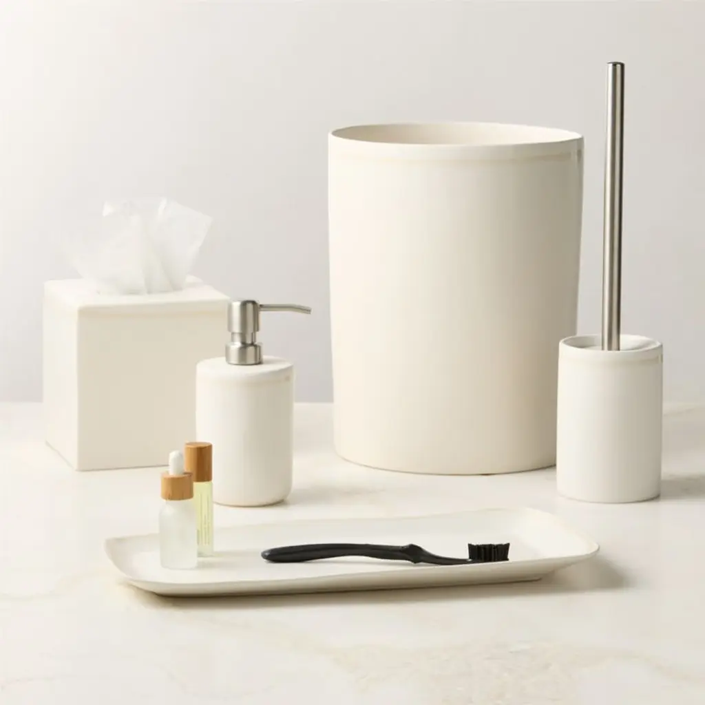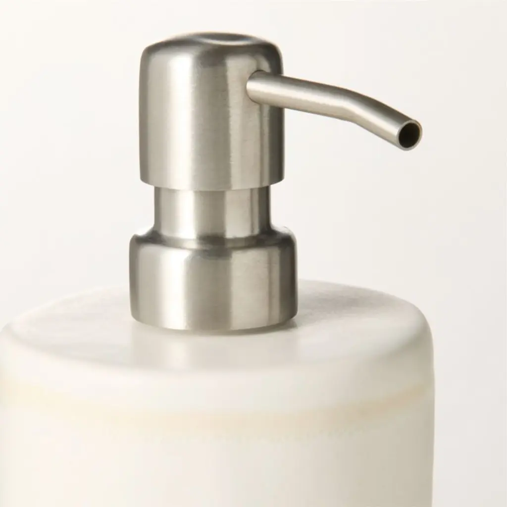 Crafted with rounded edges and a distinctive matte ivory glaze, ceramic soap dispenser is topped with a contrasting brushed nickel pump. A high-gloss glazed stripe is applied by skilled Portuguese artisans for a sophisticated detail. Pair with the other Violeta bath accessories for a coordinated look. CB2 exclusive.