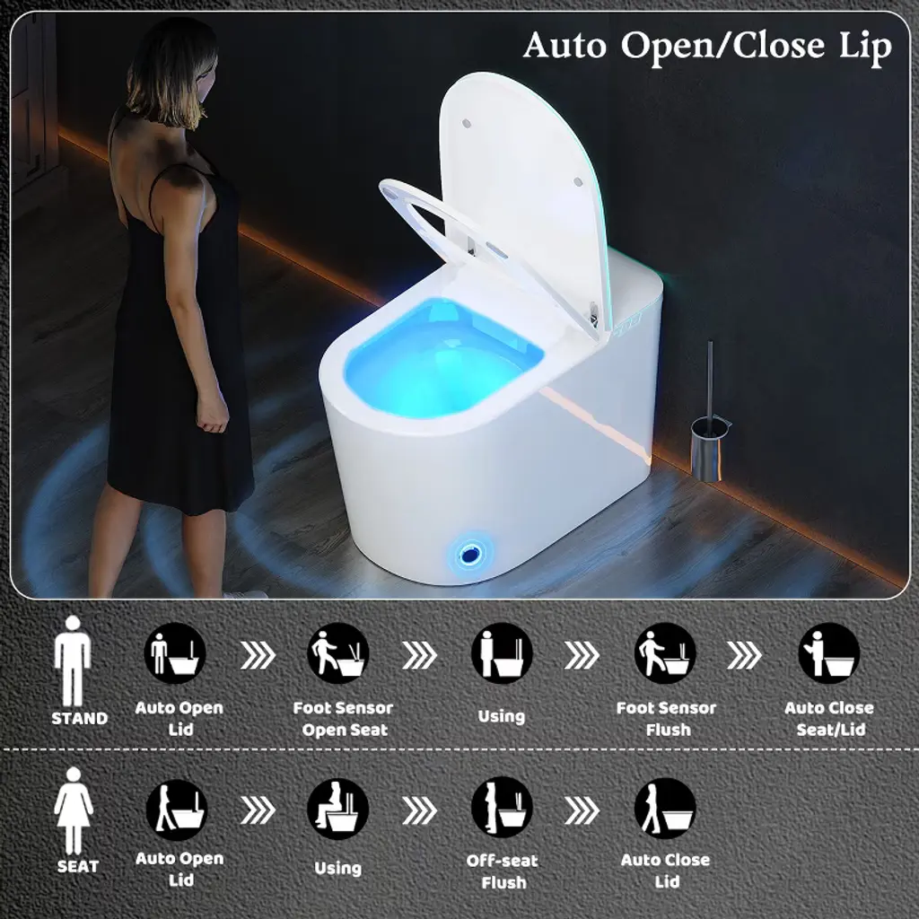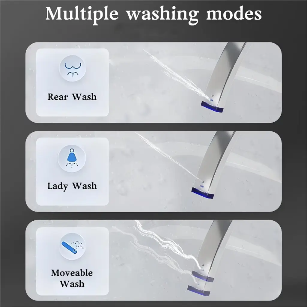 Automatic flushing: Once the user leaves the toilet, it will automatically flush, which is both worry-free and efficient. Warm air drying: Equipped with a warm air drying function, it can quickly dry the buttocks after cleaning, which is both hygienic and comfortable. It features multiple cleaning methods such as butt wash, female wash, and mobile wash, catering to different groups of people and various cleaning needs.