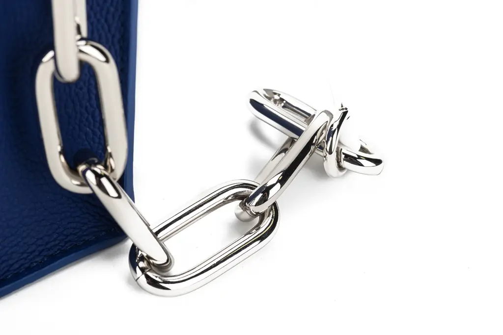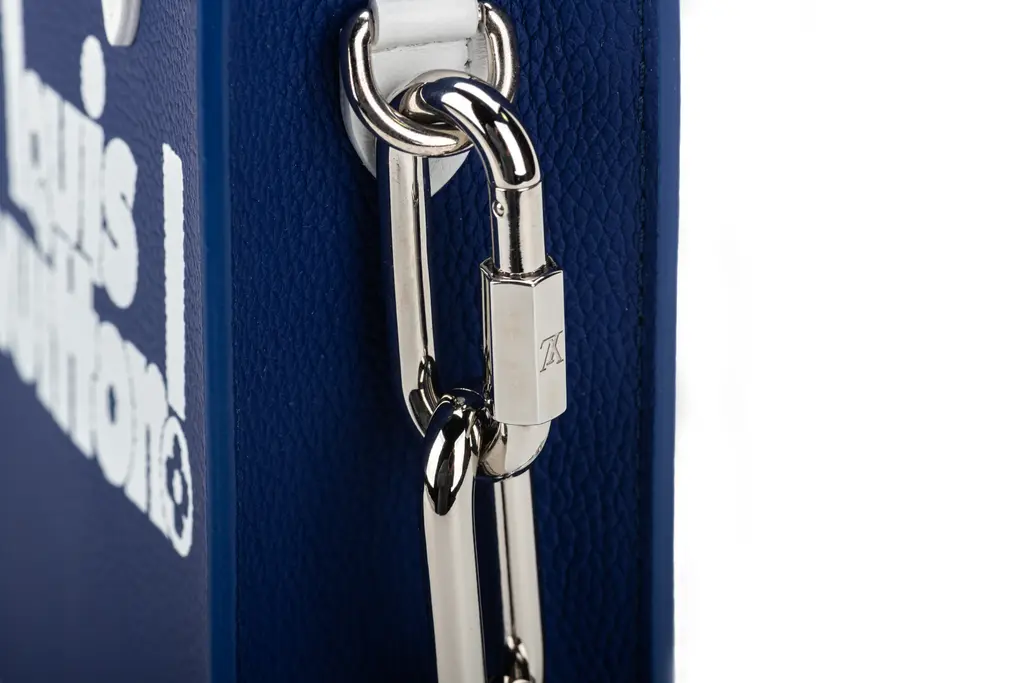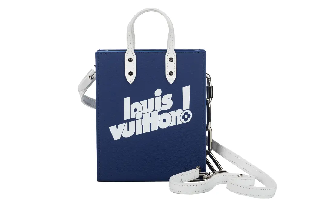 Louis Vuitton Virgil Abloh Blue Cowhide Everyday LV Sac Plat XS Silver Hardware from 2021. The bag is lined with tonal microfiber and includes a shoulder strap. The item is new and comes with the dustcover and box.