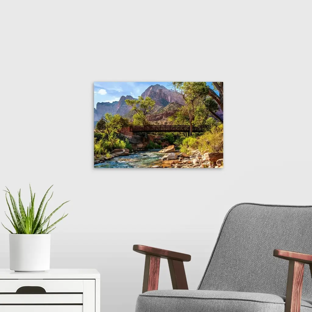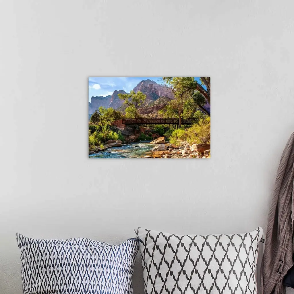 Landscape photograph of a pedestrian bridge over the Virgin River at Zion National Park, UT.