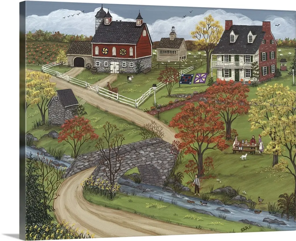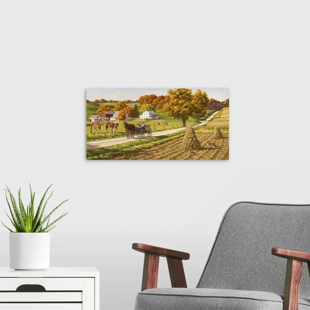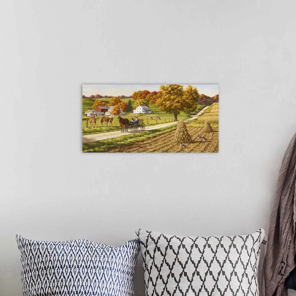 A country fall scene with a horse and buggy going down a dirt road with a couple horses and a couple cows, on the other side of the road is a corn field with geese in it.