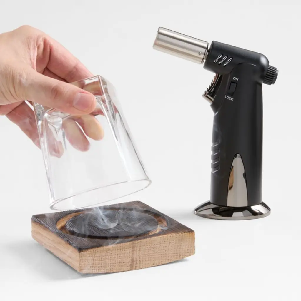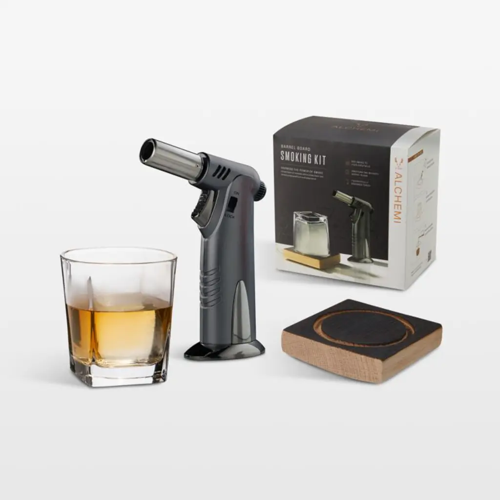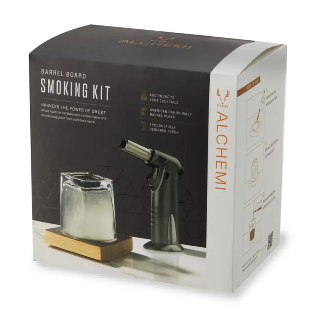 This easy-to-use smoker kit imparts the subtle taste and aroma of smoke to handcrafted cocktails. An innovative way to create different flavor profiles for old standbys such as Manhattans and Old-Fashioneds, the three-piece set also encourages experimentation with smoke-forward drinks such as a Dragon's Breath. Simply ignite the whiskey-barrel oak plank with the handheld torch, invert the rocks glass on top to collect the smoke, pour cocktail ingredients into the glass and swirl. This boxed kit makes a fun and fascinating gift for your favorite home mixologist.