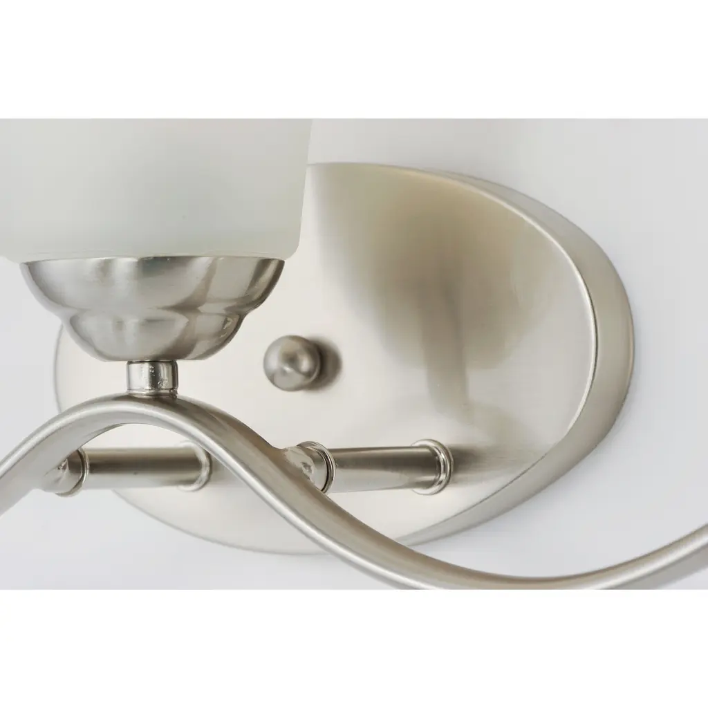 Gently waving arms of Satin Nickel or Oil Rubbed Bronze support tall-profile Frosted glass shades creating a scale normally not found in this category of lighting. The bath vanity may be installed up or down and also includes a Polished Chrome finish.