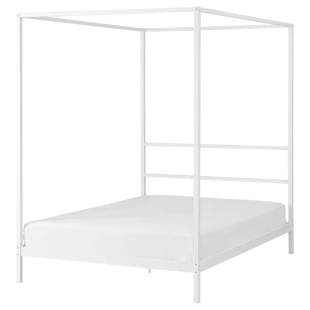 VITARNA Four-poster bed frame - white Luröy/Skådis white Full. LURÖY slatted bed base with curved slats helps to absorb your body weight and supports your body, while the open construction allows air to circulate and keeps the mattress fresh. Center support beam included.
