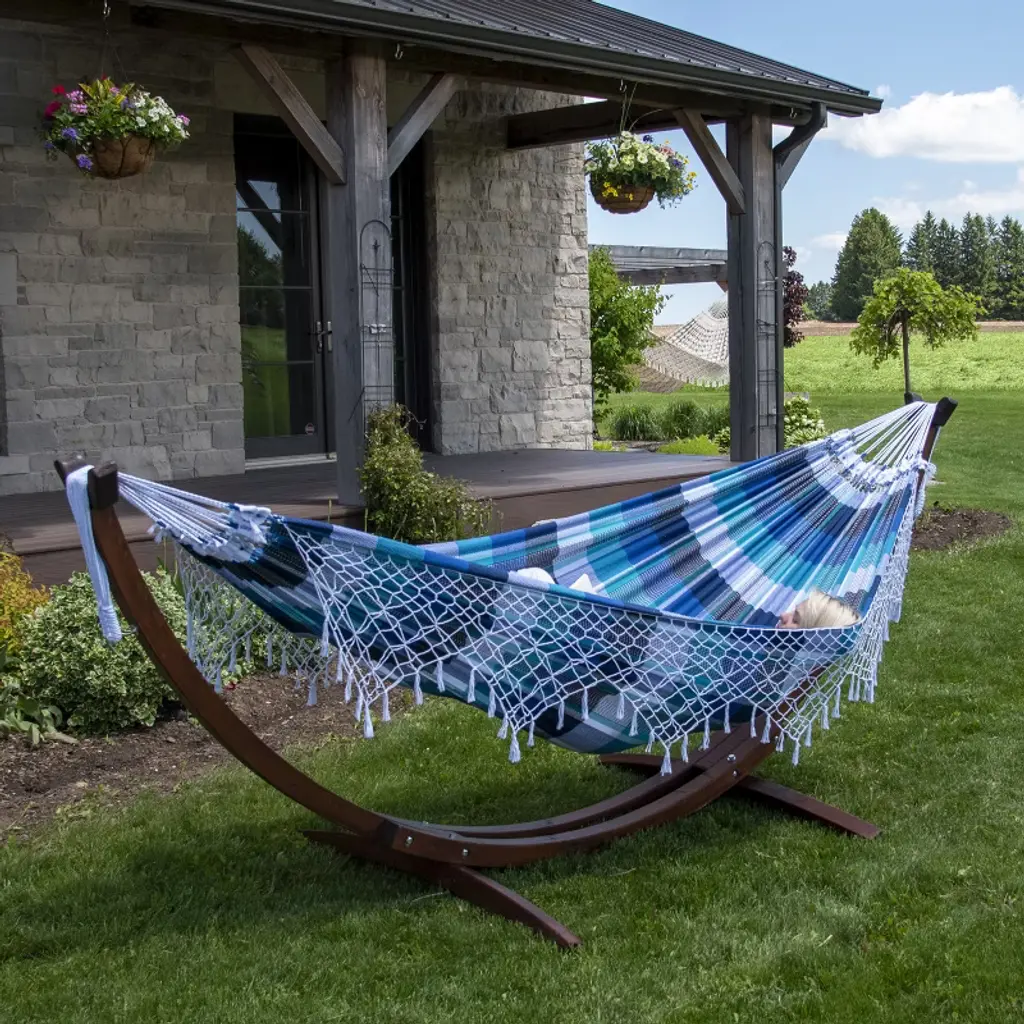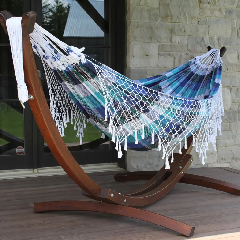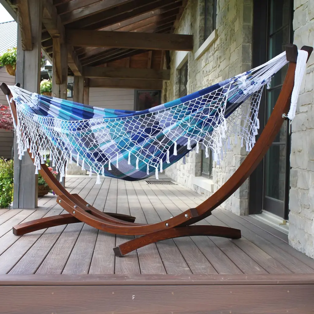 This solid wood arc paired with the double Authentic Brazilian Tropical Hammocks is simply irresistible. It is the perfect combo choice for those partial to a natural aesthetic, and compliments the outdoor space of those who prefer an immaculately manicured environment. The Solid Pine Arc Stand combined with your choice out of 3 Authentic Brazilian Tropical hammock colors is tailored for your relaxation.