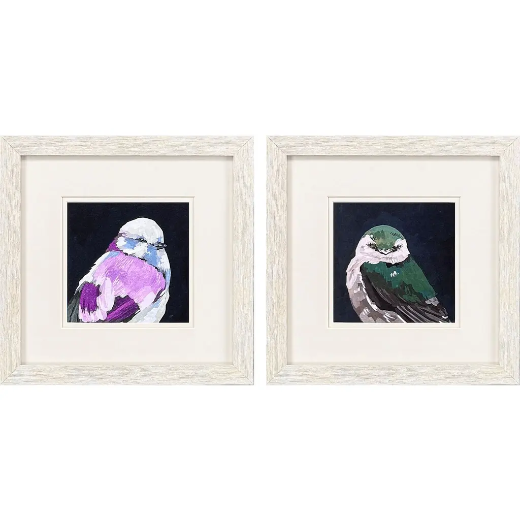 Vibrant blue bird prints have a modern sense of whimsy. Double matted in light buff and framed in a distressed whitewash finish molding.