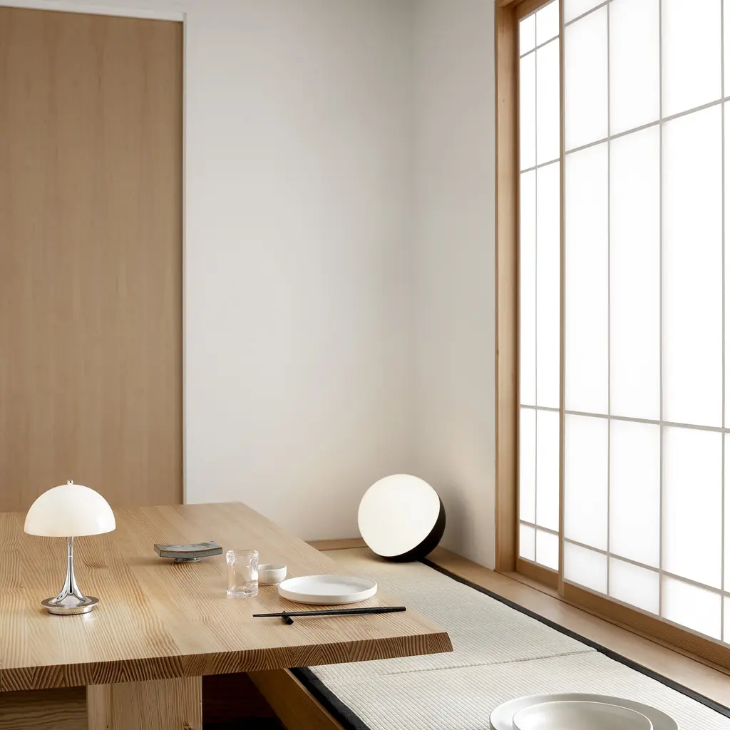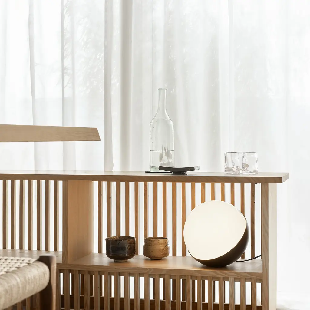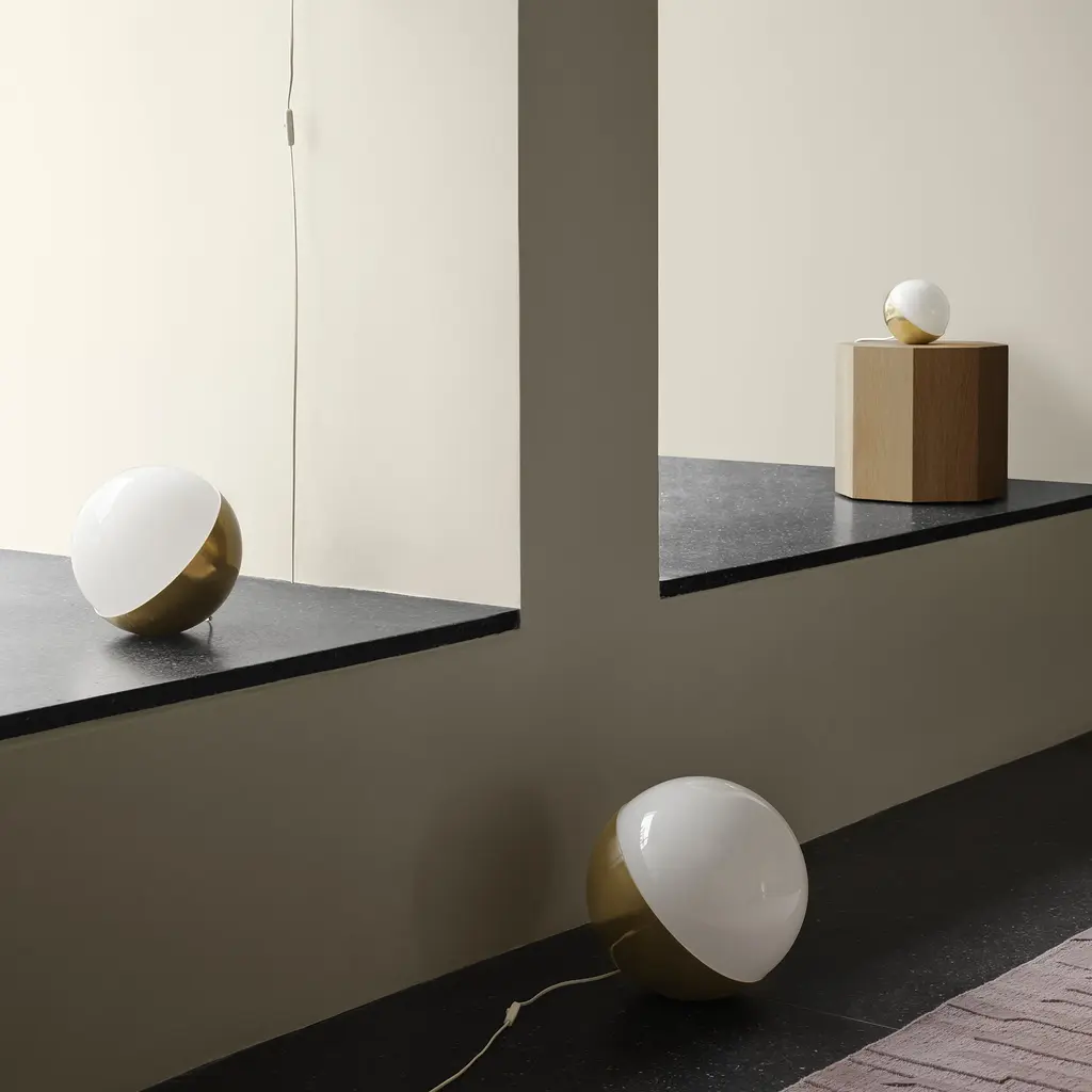 Suggested by 1940s Vilhelm Lauritzen originals for the Danish Broadcasting Co., VL Studio creates a diffused light through a striking handblown round of opaline glass for a warm surrounding glow. In either polished brass that has been slightly brushed or matte-black for a more graphic effect, it comes in 3 sizes that each can be positioned as a floor lamp or a table light as desired.