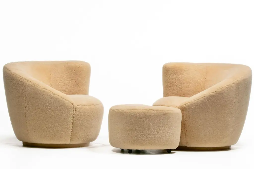 Vladimir Kagan Nautilus Swivel Chairs & Ottoman In Butterscotch Shearling