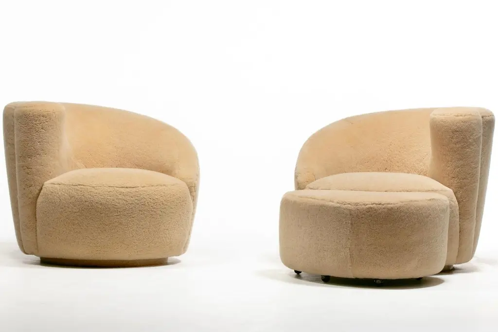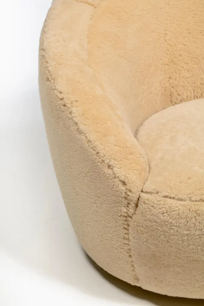 Amongst the most popular Vladimir Kagan designs, these Nautilus swivel lounge chairs are sculptural, comfortable and fun, and were freshly upholstered in hand sewn butterscotch shearling hides. The new shearling upholstery is supple, soft and luxurious, and warms up the chair's modern silhouette with a warm and inviting organic texture. Corkscrew shape with sloped back and scrolled arm. The Nautilus chairs swivel making them a good choice for open floor plans - you may align your sight with any person or object in the room simply with a gentle swivel. Matching custom contoured Ottoman is on casters and seamlessly rolls into place like a puzzle piece inviting you to relax and put your feet up with a good book or a glass of your favorite vino. One of a kind set you won't see anywhere else.Nautilus Swivel Chairs: 36” W x 33” D x 29” H (Seat Height 17”)Ottoman: 33” W x 21” D x 17” H