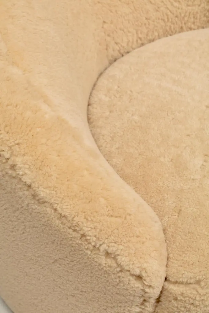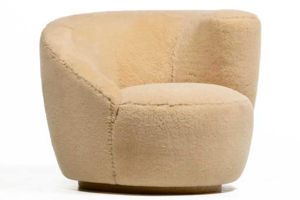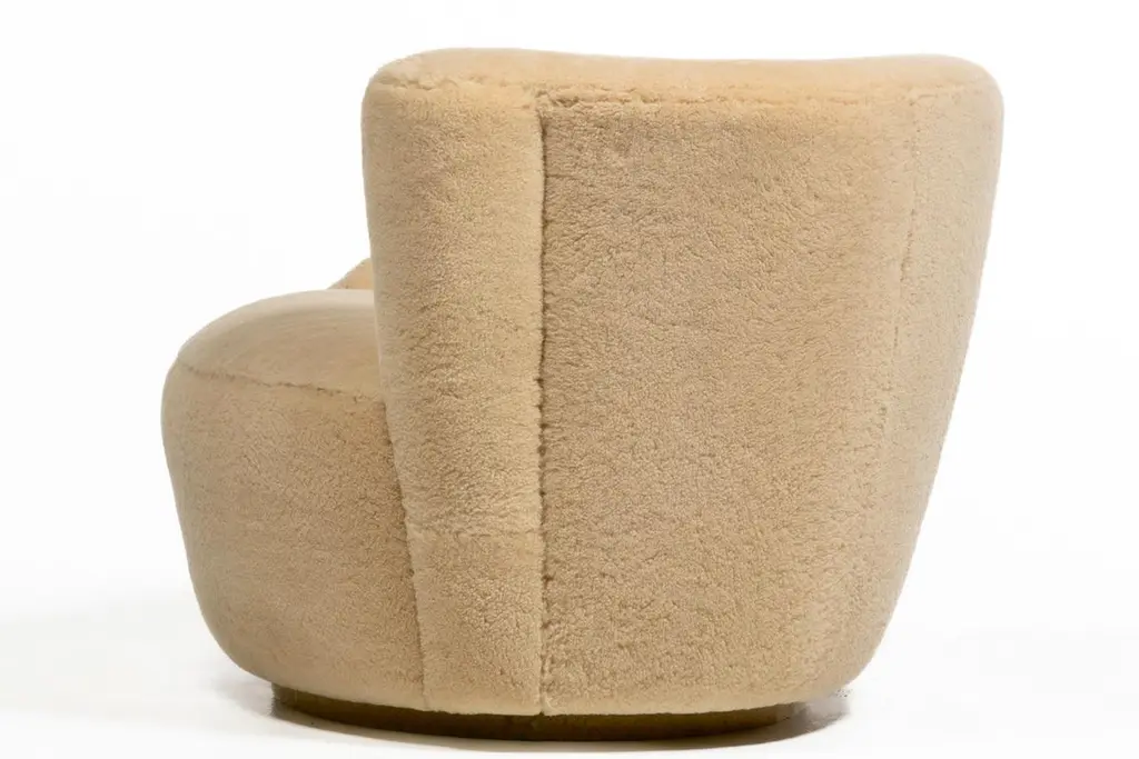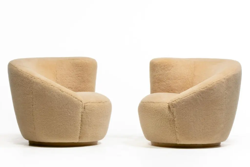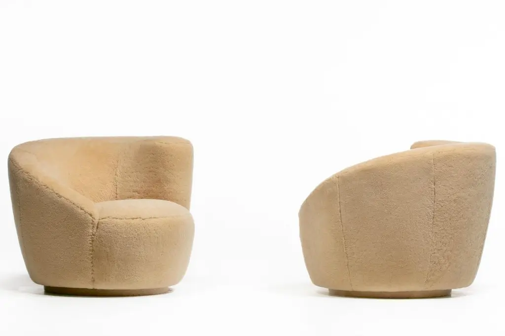 Amongst the most popular of his designs, here is a knockout set of sculptural Vladimir Kagan Nautilus swivel lounge chairs and ottomans freshly upholstered in hand sewn butterscotch shearling hides. The new shearling upholstery is supple, soft and luxurious, and warms up the chair's modern silhouette with a warm and inviting organic texture. Comfortable. Iconic. Corkscrew shape with sloped back and scrolled arm. The Nautilus chairs swivel making them a good choice for open floor plans - you may align your sight with any person or object in the room simply with a gentle swivel. Matching custom contoured Ottomans are on casters and seamlessly roll into place like puzzle pieces inviting you to relax and put your feet up with a good book or a glass of your favorite vino. One of a kind set you won't see anywhere else.Nautilus Swivel Chairs: 36” W x 33” D x 29” H (Seat Height 17”)Ottoman: 33” W x 21” D x 17” H
