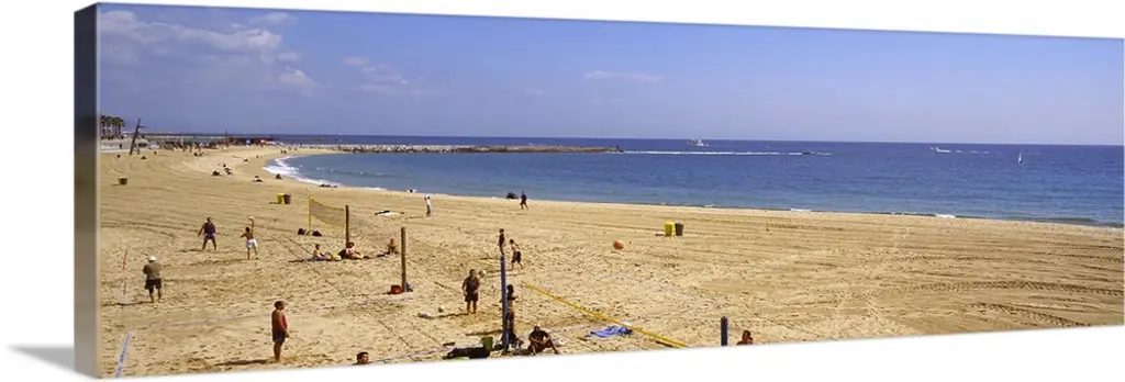 Row of empty volleyball courts on the white sand beach on a clear day.