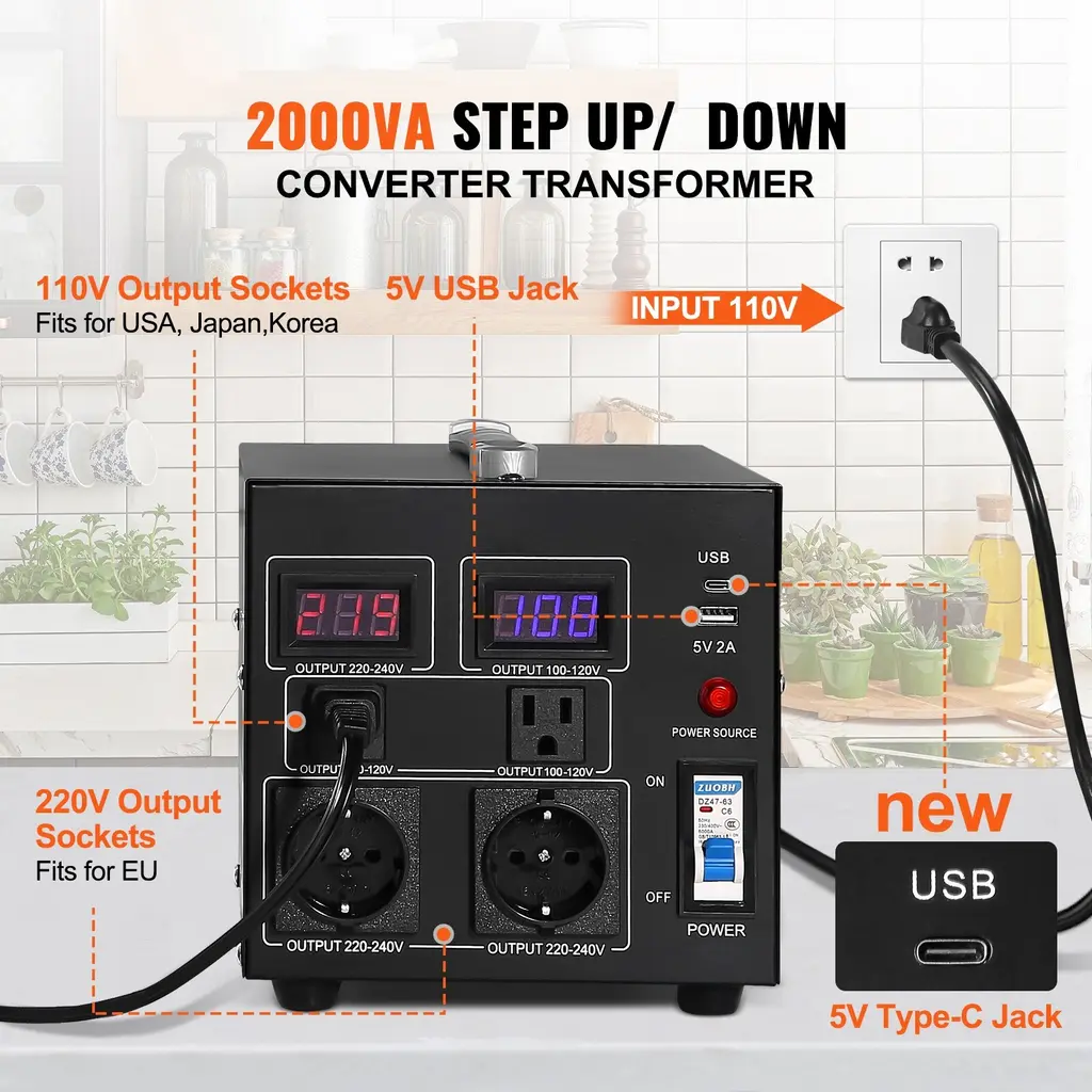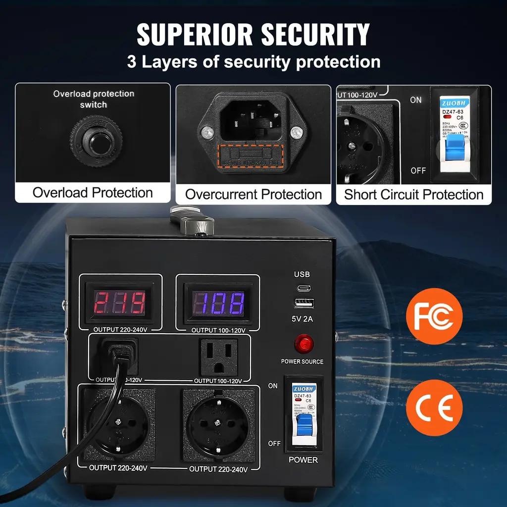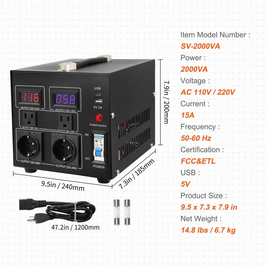 500W / 3000W / 2000W Voltage Converter Transformer: For 500W option: This step up down transformer features 4 AC plugs, including 2 US NEMA 5-15R 3-Pin output sockets, 2 European Shucko output sockets, 1 5V USB port, and 1 Type-C jack. For 3000W option: This step up down transformer features 6 AC plugs, including 3 US NEMA 5-15R 3-Pin output sockets, 3 European Shucko output sockets, 1 5V USB port, and 1 Type-C jack. For 2000W option: This step up down transformer features 4 AC plugs, including 2 US NEMA 5-15R 3-Pin output sockets, 2 European Shucko output sockets, 1 5V USB port, and 1 Type-C jack. It is built with 2 LED displays showing the current output voltage in real-time to avoid transformer overload. Advanced Step-Up/Down Technology: By adjusting the input voltage switch, you can step up the input voltage from 110 volts to 220 volts or step down from 220 volts to 110 volts. Please switch to the correct voltage before powering on. Universal power wiring slot allows you to purchase a separate power cord to connect and use according to the jack in different countries. CE & FCC Certification: Our step up down converter have CE and FCC certification, so you can use them with more peace of mind. It is equipped with internal overload protection, overcurrent protection, and short circuit protection to reduce the risk caused by improper use effectively. For 500W and 2000W option: It is also equipped with 2 spare fuses for replacement. Efficient & Quiet Operation: This voltage converter transformer adopts high-quality toroidal coils for 7x24 hours of continuous operation, which helps reduce noise, odor, and product weight effectively. It runs quietly and provides precise voltage to power your devices without problems or damage. (For the best experience, it is recommended to purchase a voltage converter with a load power at least 25% higher than the total power of your device) Portable & Compact Design: The step up step down transformer size is 9.5 x 7.3 x 7.9 in (240 x 185 x 200 mm, for 500W and 2000W options) / 10.6 x 9.5 x 8.5 in (270 x 240 x 215 mm, for 3000W option), not taking up too much space. With an 11.2 lbs (5.1 kg, 500W option) / 20.1 lbs (9.1 kg, 3000W option) / 14.8 lbs (6.7 kg, 2000W option) net weight and convenient handle design, it is easy to carry and transport without effort. Package Content 1 x Step Up Down Transformer 2 x Fuses (only for 500W and 2000W options) 1 x Power Cord 1 x User Manual