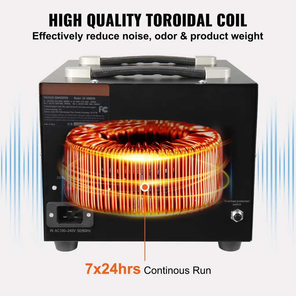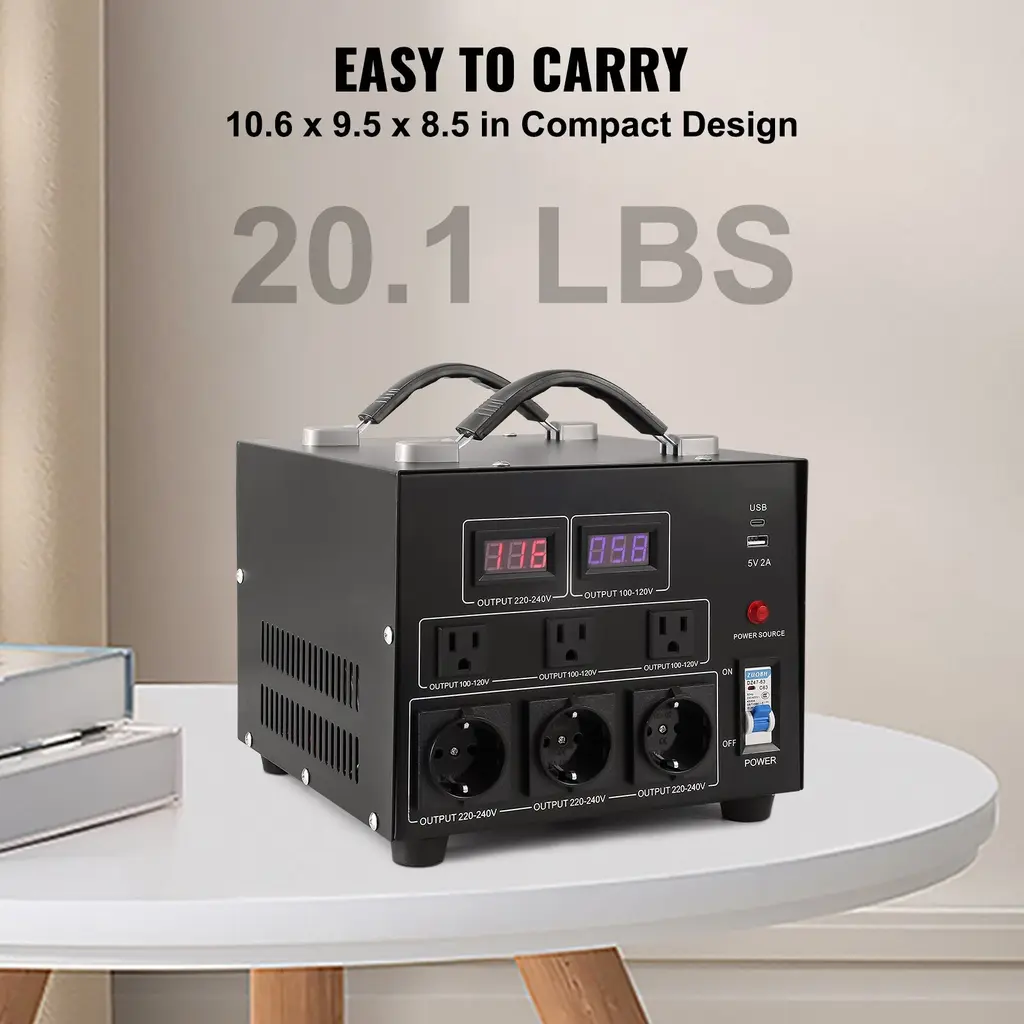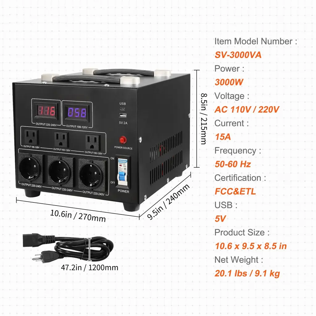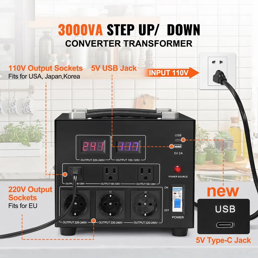 500W / 3000W / 2000W Voltage Converter Transformer: For 500W option: This step up down transformer features 4 AC plugs, including 2 US NEMA 5-15R 3-Pin output sockets, 2 European Shucko output sockets, 1 5V USB port, and 1 Type-C jack. For 3000W option: This step up down transformer features 6 AC plugs, including 3 US NEMA 5-15R 3-Pin output sockets, 3 European Shucko output sockets, 1 5V USB port, and 1 Type-C jack. For 2000W option: This step up down transformer features 4 AC plugs, including 2 US NEMA 5-15R 3-Pin output sockets, 2 European Shucko output sockets, 1 5V USB port, and 1 Type-C jack. It is built with 2 LED displays showing the current output voltage in real-time to avoid transformer overload. Advanced Step-Up/Down Technology: By adjusting the input voltage switch, you can step up the input voltage from 110 volts to 220 volts or step down from 220 volts to 110 volts. Please switch to the correct voltage before powering on. Universal power wiring slot allows you to purchase a separate power cord to connect and use according to the jack in different countries. CE & FCC Certification: Our step up down converter have CE and FCC certification, so you can use them with more peace of mind. It is equipped with internal overload protection, overcurrent protection, and short circuit protection to reduce the risk caused by improper use effectively. For 500W and 2000W option: It is also equipped with 2 spare fuses for replacement. Efficient & Quiet Operation: This voltage converter transformer adopts high-quality toroidal coils for 7x24 hours of continuous operation, which helps reduce noise, odor, and product weight effectively. It runs quietly and provides precise voltage to power your devices without problems or damage. (For the best experience, it is recommended to purchase a voltage converter with a load power at least 25% higher than the total power of your device) Portable & Compact Design: The step up step down transformer size is 9.5 x 7.3 x 7.9 in (240 x 185 x 200 mm, for 500W and 2000W options) / 10.6 x 9.5 x 8.5 in (270 x 240 x 215 mm, for 3000W option), not taking up too much space. With an 11.2 lbs (5.1 kg, 500W option) / 20.1 lbs (9.1 kg, 3000W option) / 14.8 lbs (6.7 kg, 2000W option) net weight and convenient handle design, it is easy to carry and transport without effort. Package Content 1 x Step Up Down Transformer 2 x Fuses (only for 500W and 2000W options) 1 x Power Cord 1 x User Manual