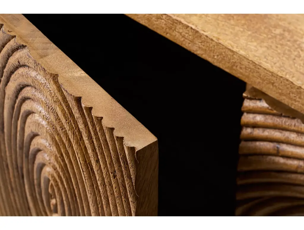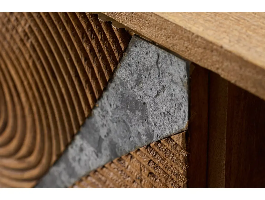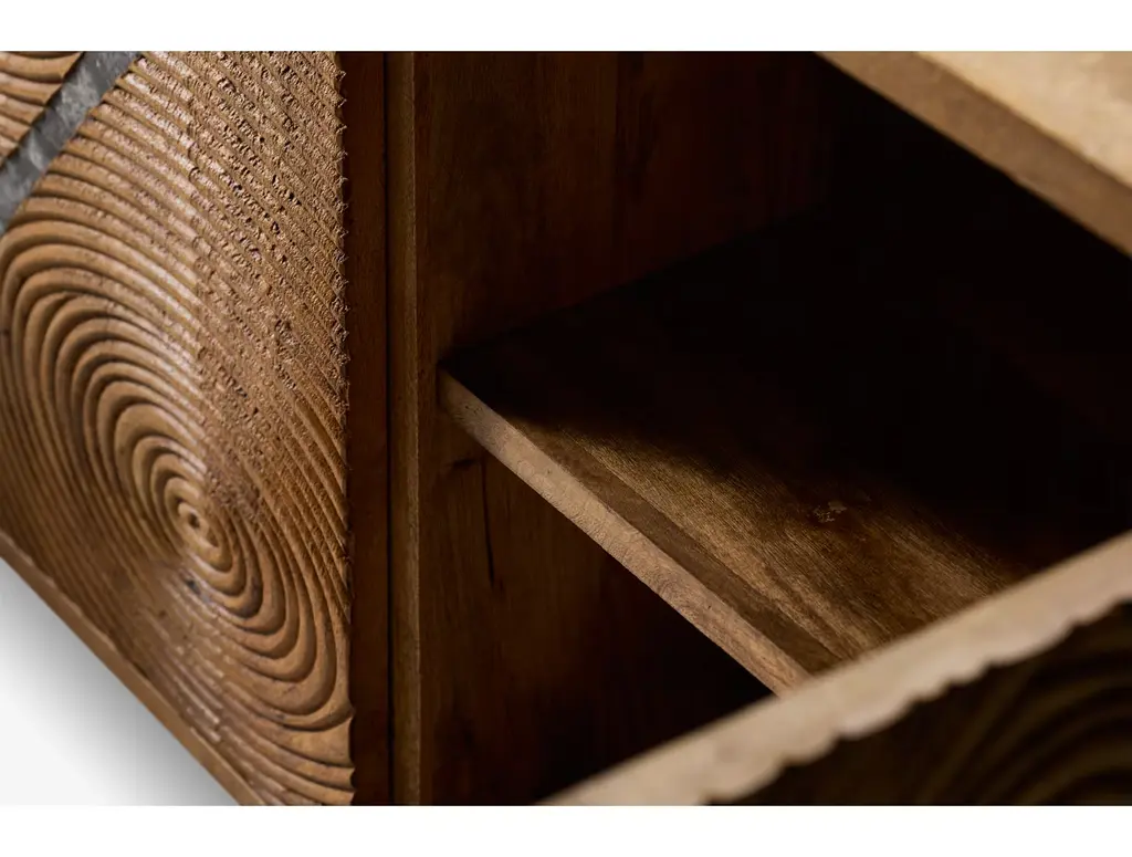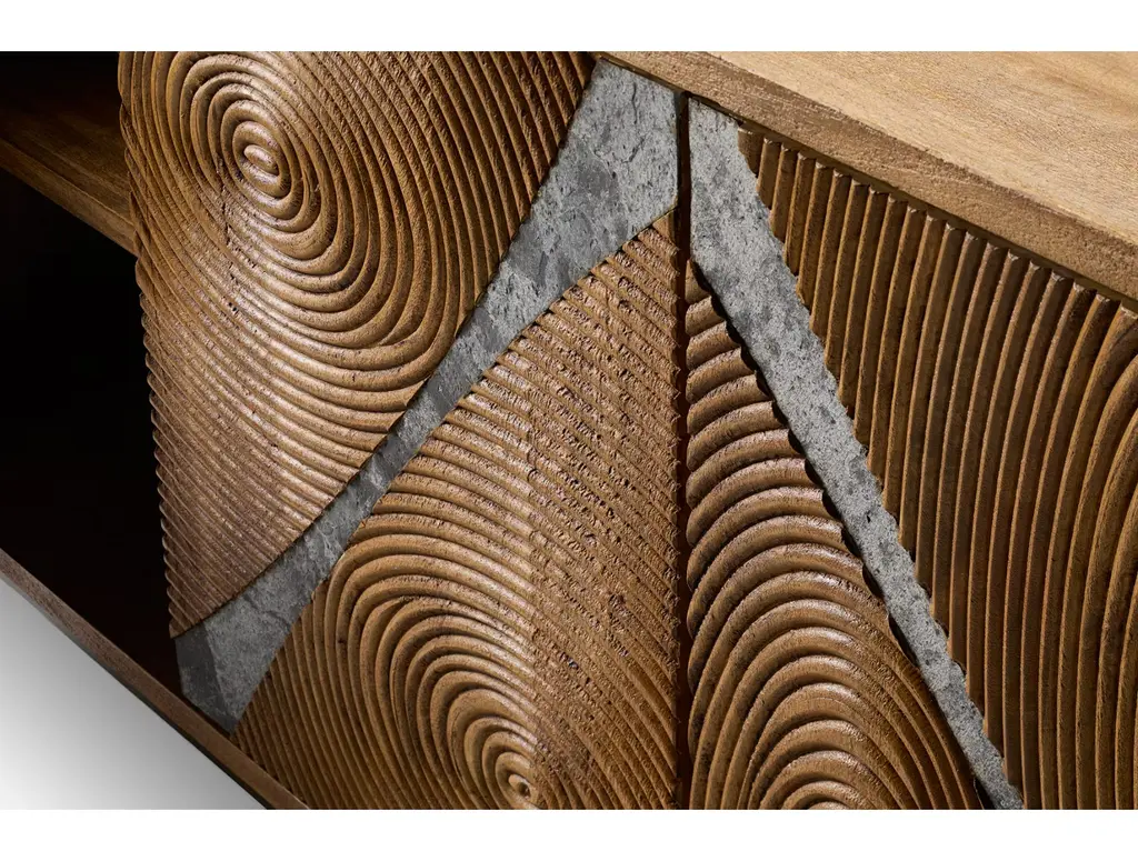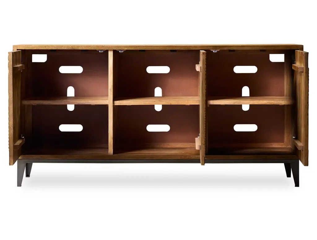 Bring stylish storage to your space with the Vortex Credenza from Hooker Furniture. This transitional-style credenza features three doors with a swirled groove design accented with diagonal slate inlays for a strikingly unique look. Inside removable shelves offer plenty of storage options, and the ventilated back panel includes cutouts for wire management. A mid-century style metal base and tapered legs offer support for this chic credenza.