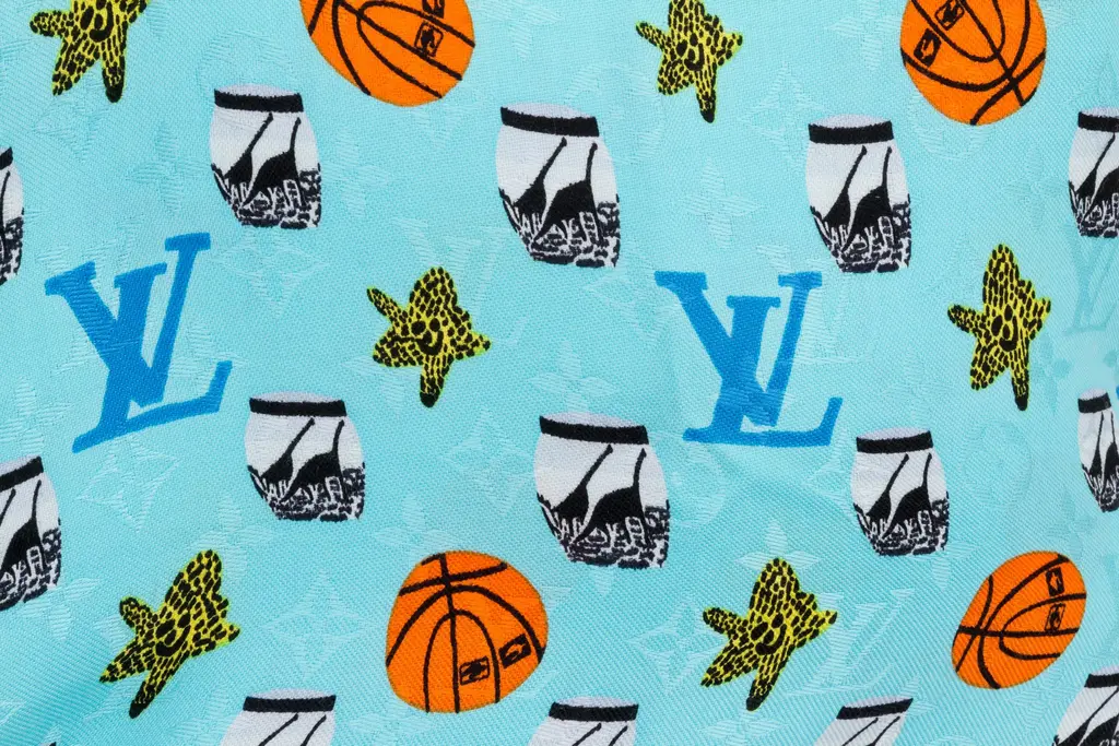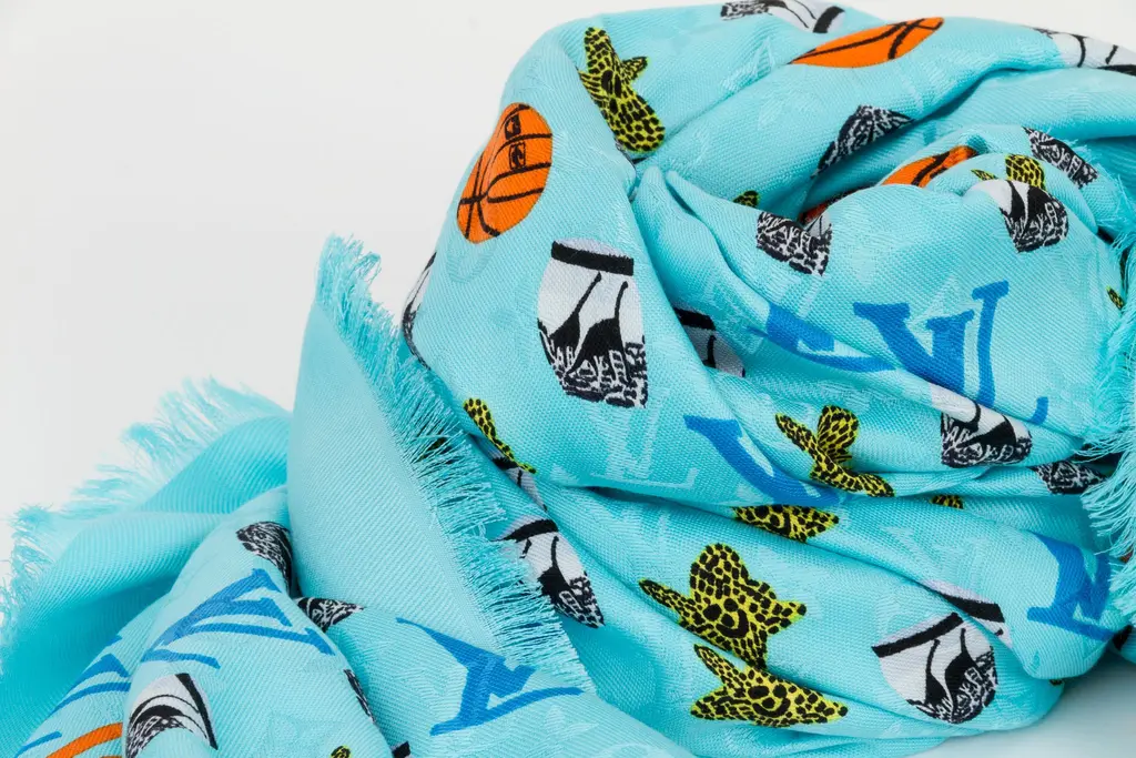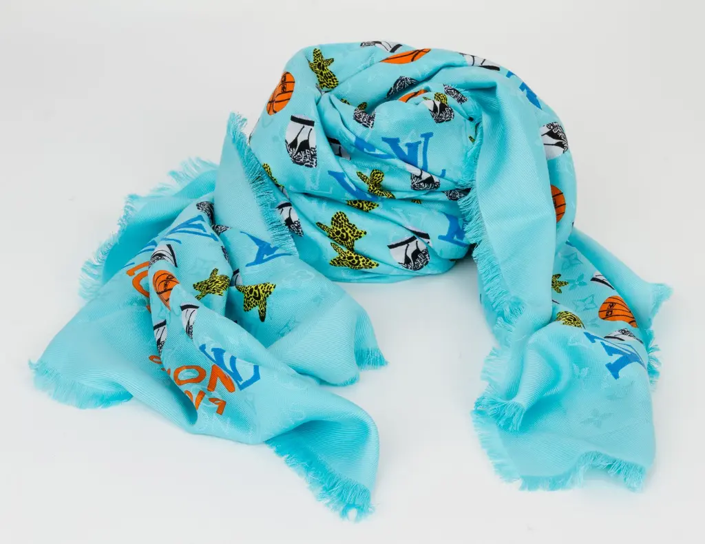 Louis Vuitton limited edition oversized turquoise silk and wool shawl with basketballs and logos design. Jacquard weave. Fringe finish.