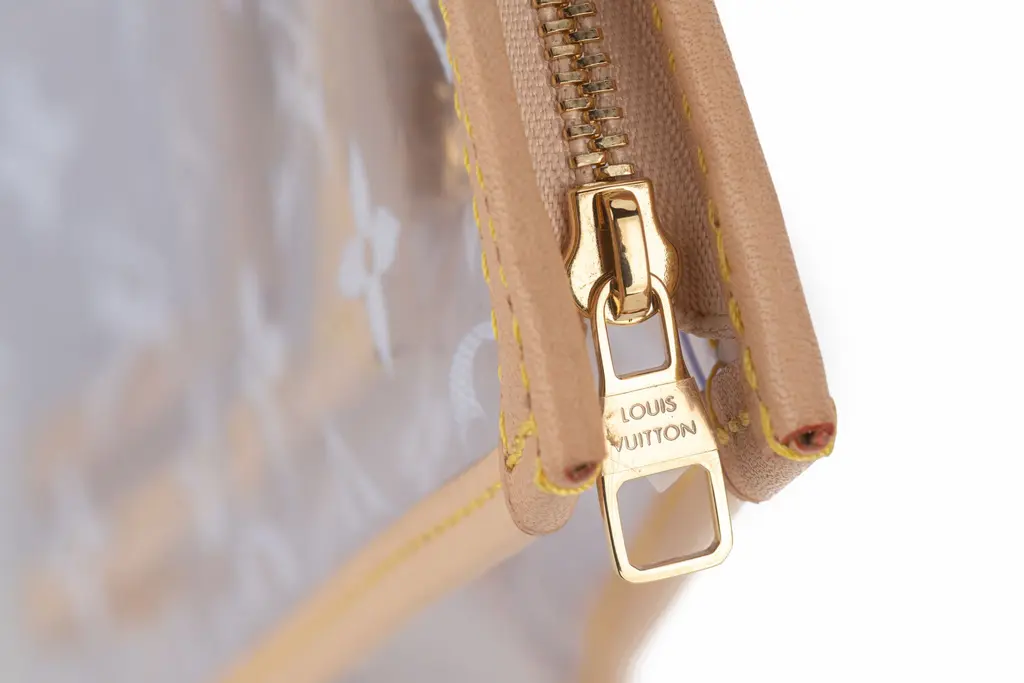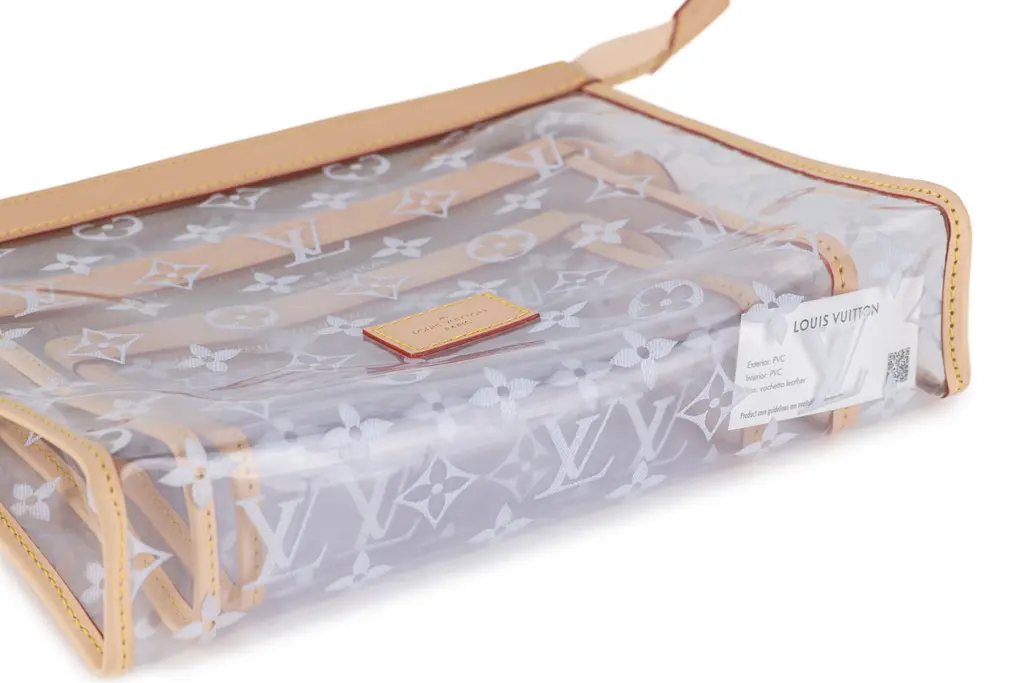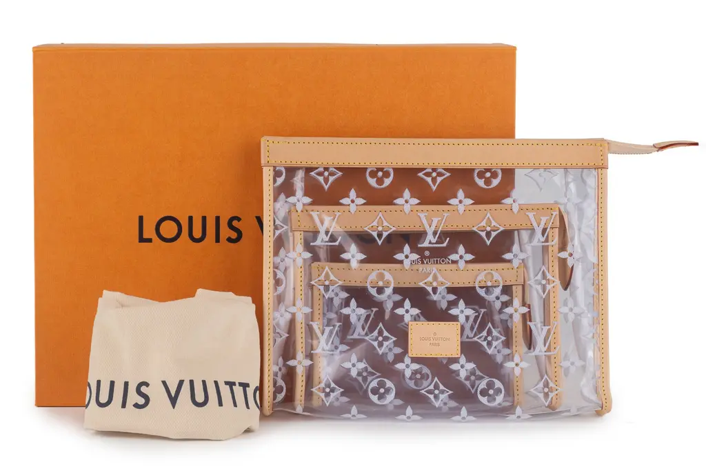 The translucent Trio Poche Toilette is the perfect way to organize belongings inside a travel or city bag. The three zipped pouches are each a different size. The medium-sized pouch is perfectly adapted for airport security as its capacity is exactly one liter. The subtle Monogram print and natural cowhide leather bring style. Comes with original dust cover and box. The medium pouch measures 7.5", 2", 5.5" and the small 6", 1.75" and 4.25". New in unused condition.
