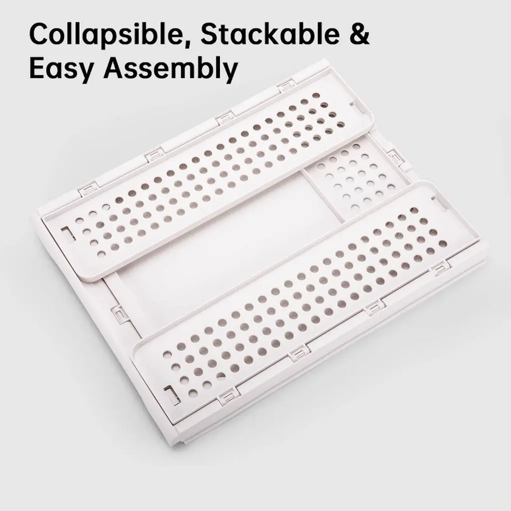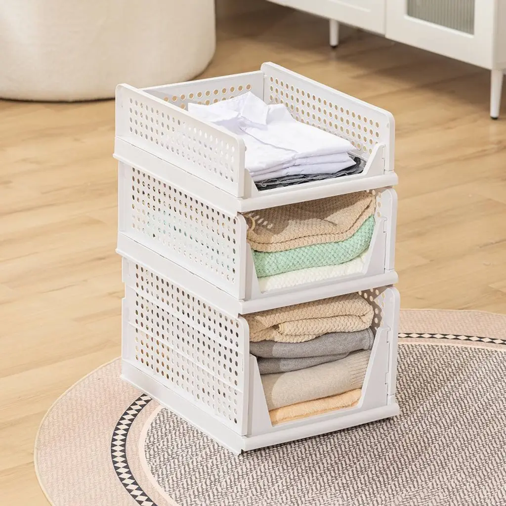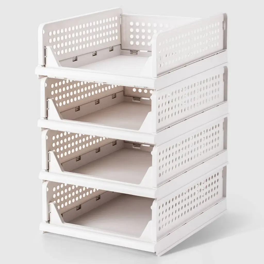 Maximize your storage space with the VUSIGN Stackable Plastic Storage Baskets. This 4-pack of foldable storage bins is perfect for organizing closets, shelves, kitchens, bathrooms, offices, and dorms. Designed for versatility and convenience, these bins offer ample space for clothes, toiletries, pantry items, office supplies, and more, keeping your essentials neatly arranged. The stackable design allows for efficient vertical storage, while the ventilated structure ensures airflow and easy visibility. Made from durable, lightweight plastic, each bin folds flat when not in use, saving space and simplifying storage. With a generous size (17.2'' * 13.2'' * 7.4''), these baskets provide a stylish and practical solution for a clutter-free home.