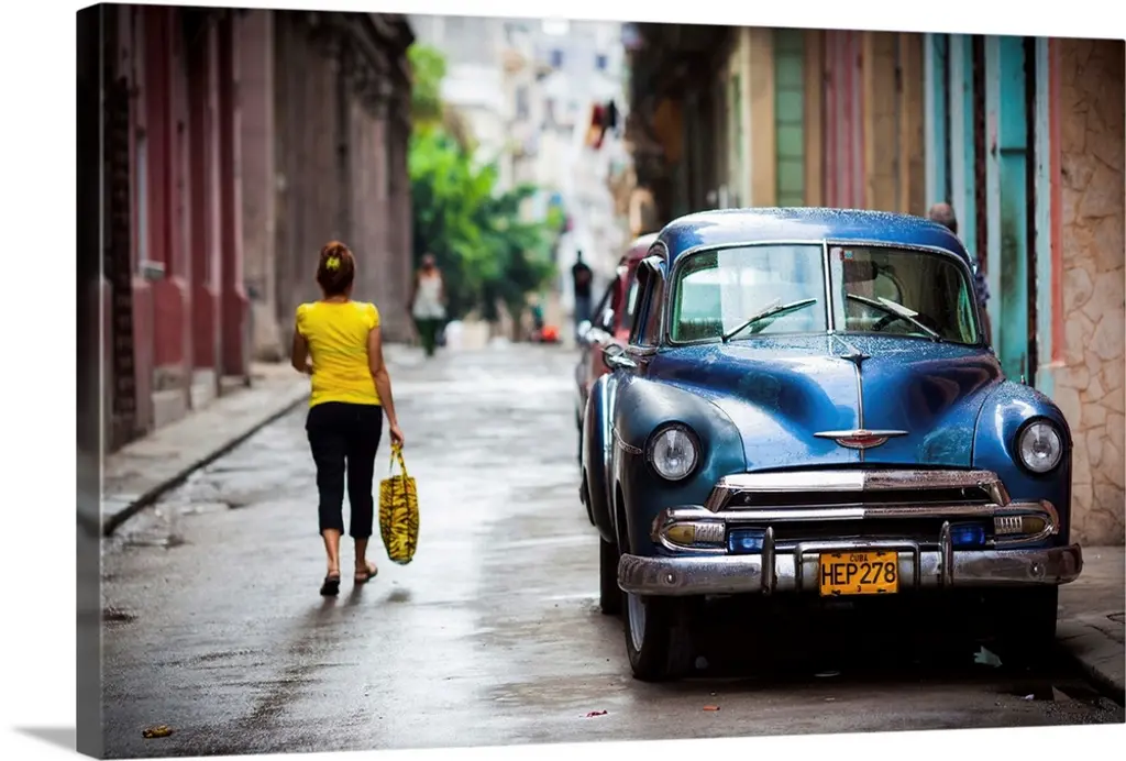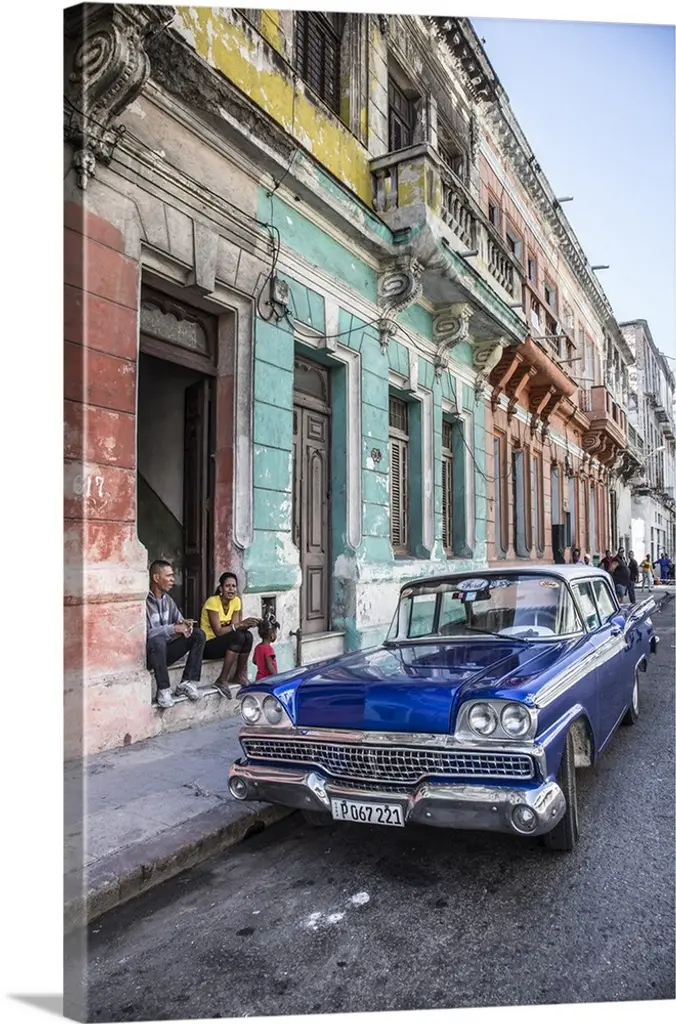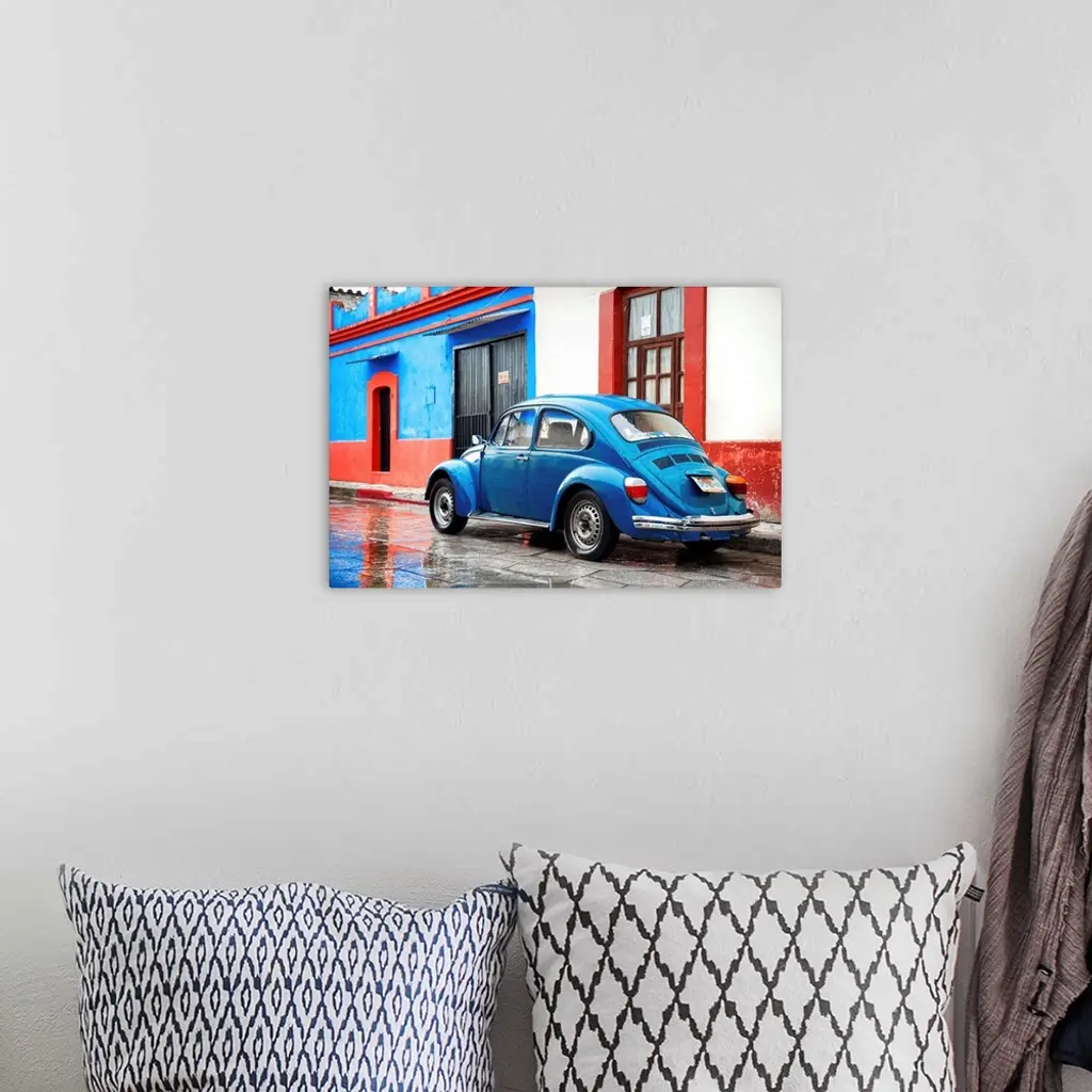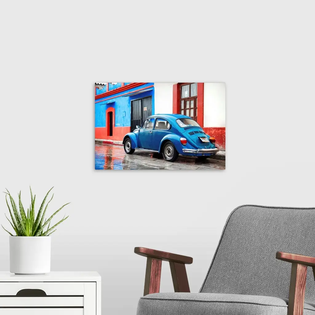 Photograph of a classic blue Volkswagen Beetle parked in front of a blue and red building. From the Viva Mexico Collection.