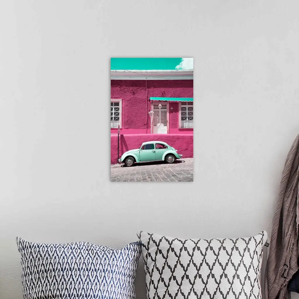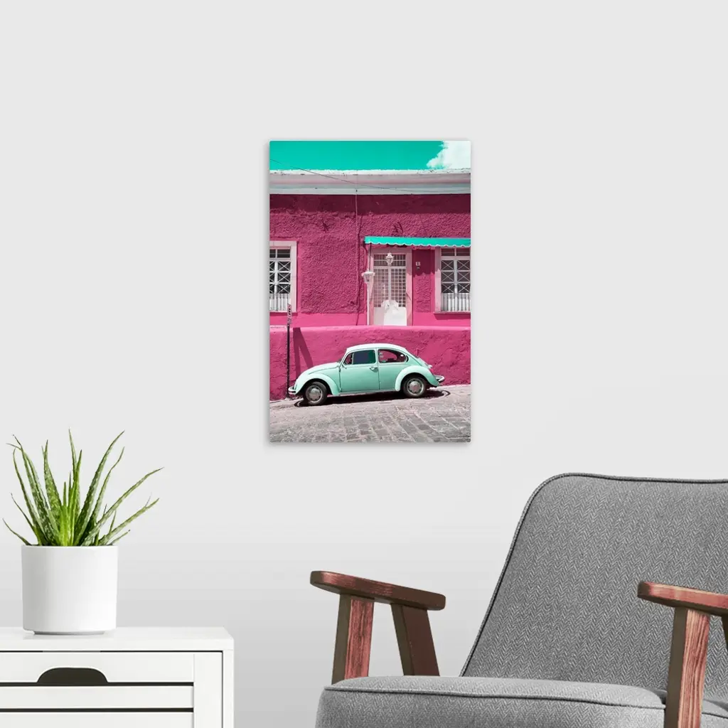 Photograph of a classic Volkswagen Beetle in front of a pink and teal building. From the Viva Mexico Collection.